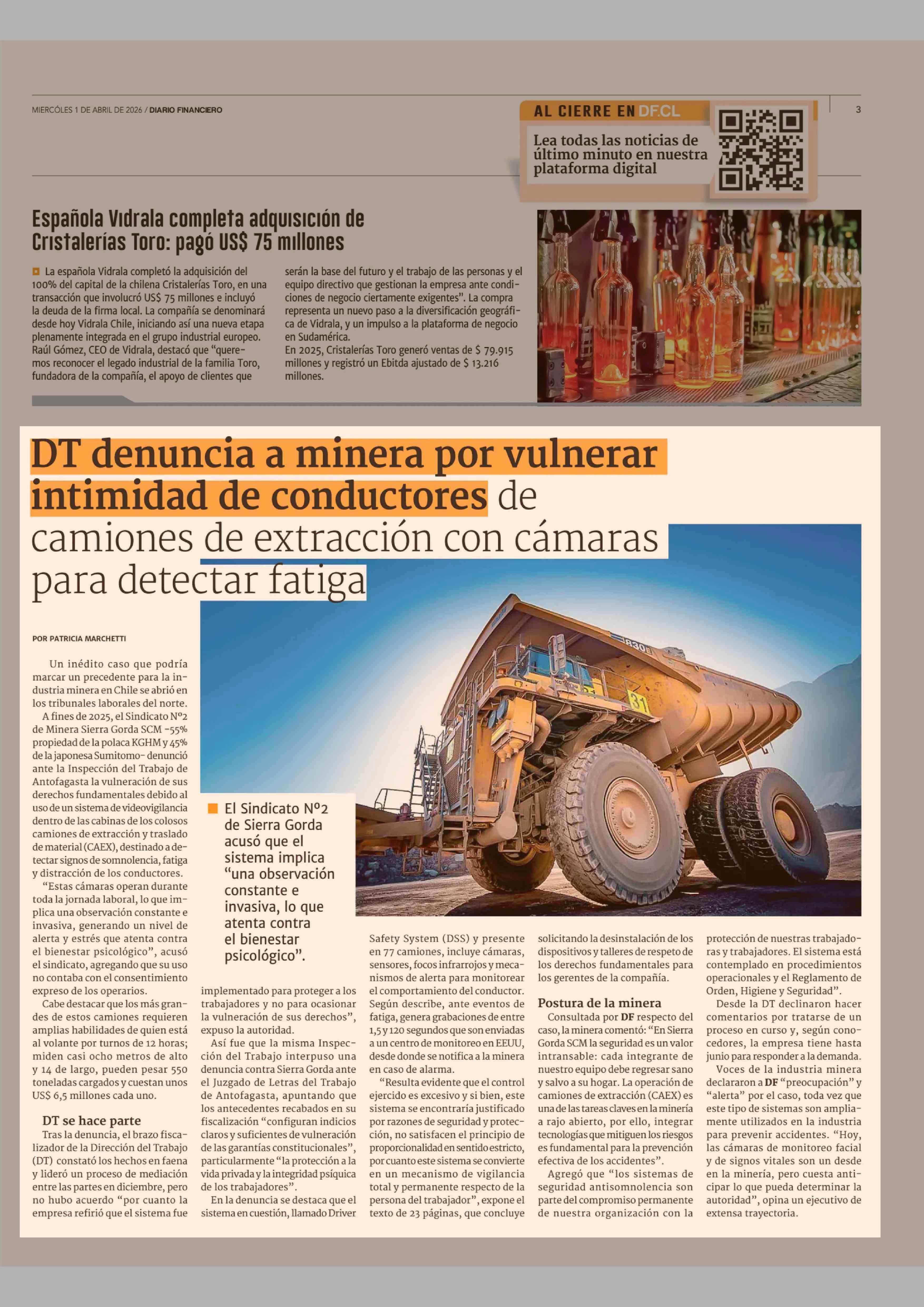 DT denuncia a minera por vulnerar intimidad de conductores de camiones de extracción con cámaras para detectar fatiga 01-04-2026 Diario Financiero |