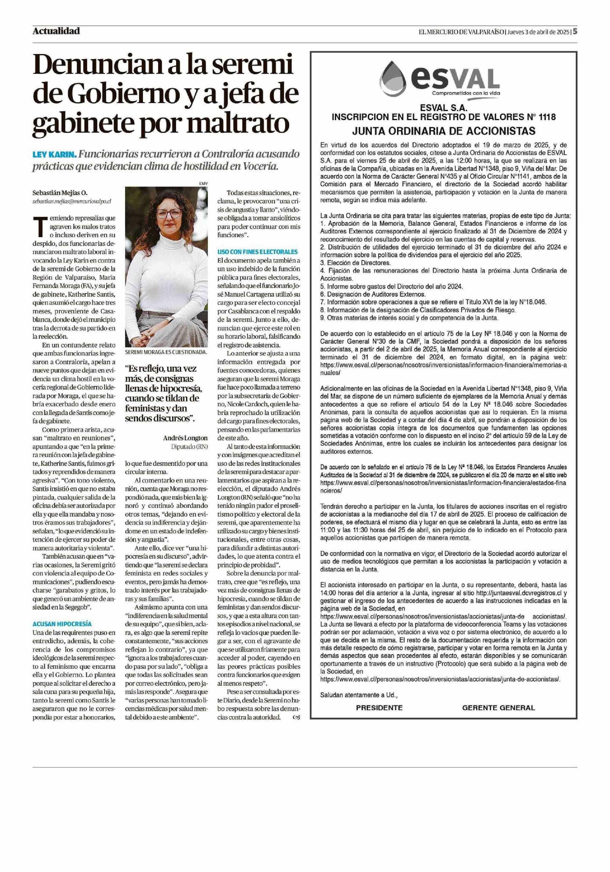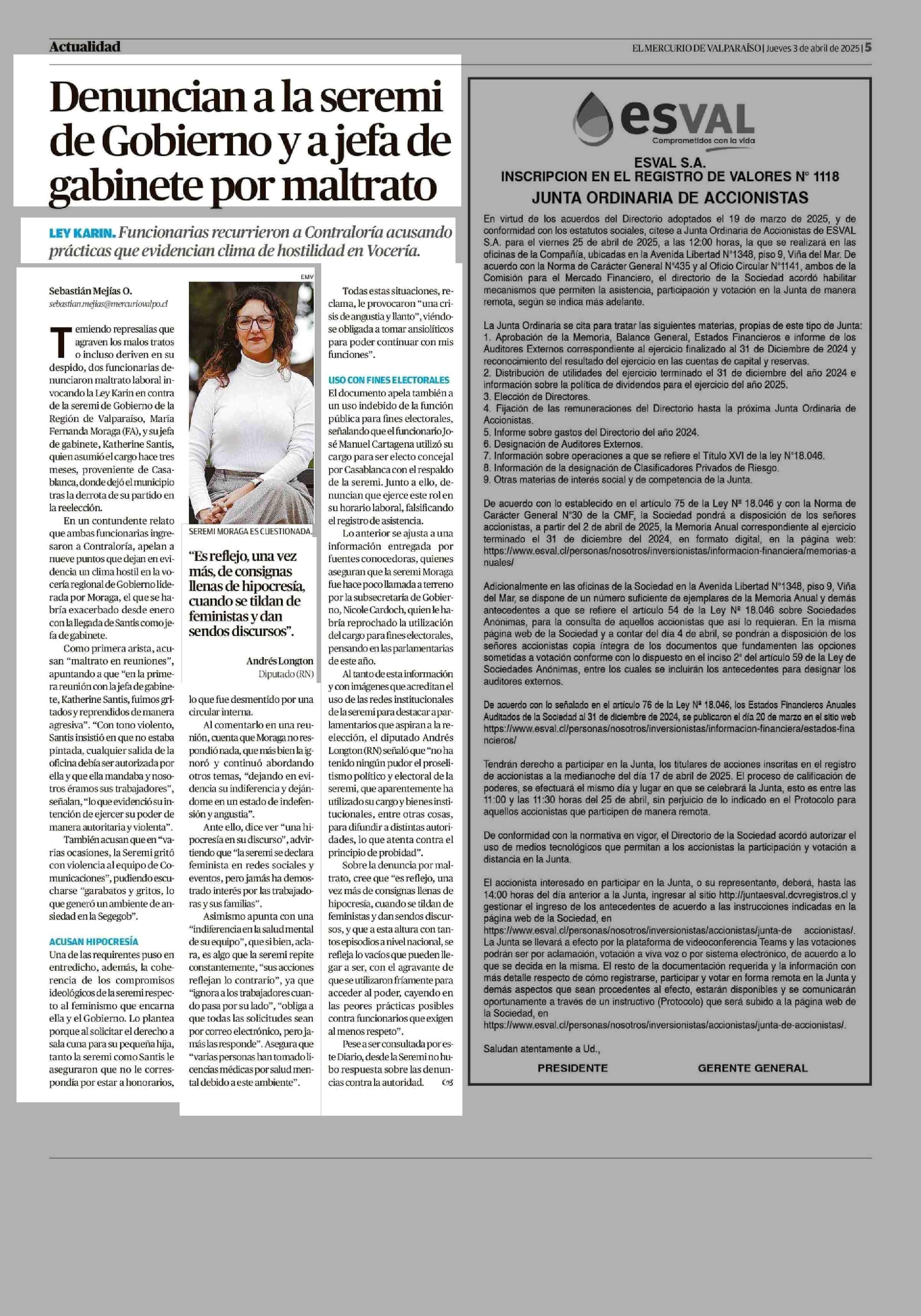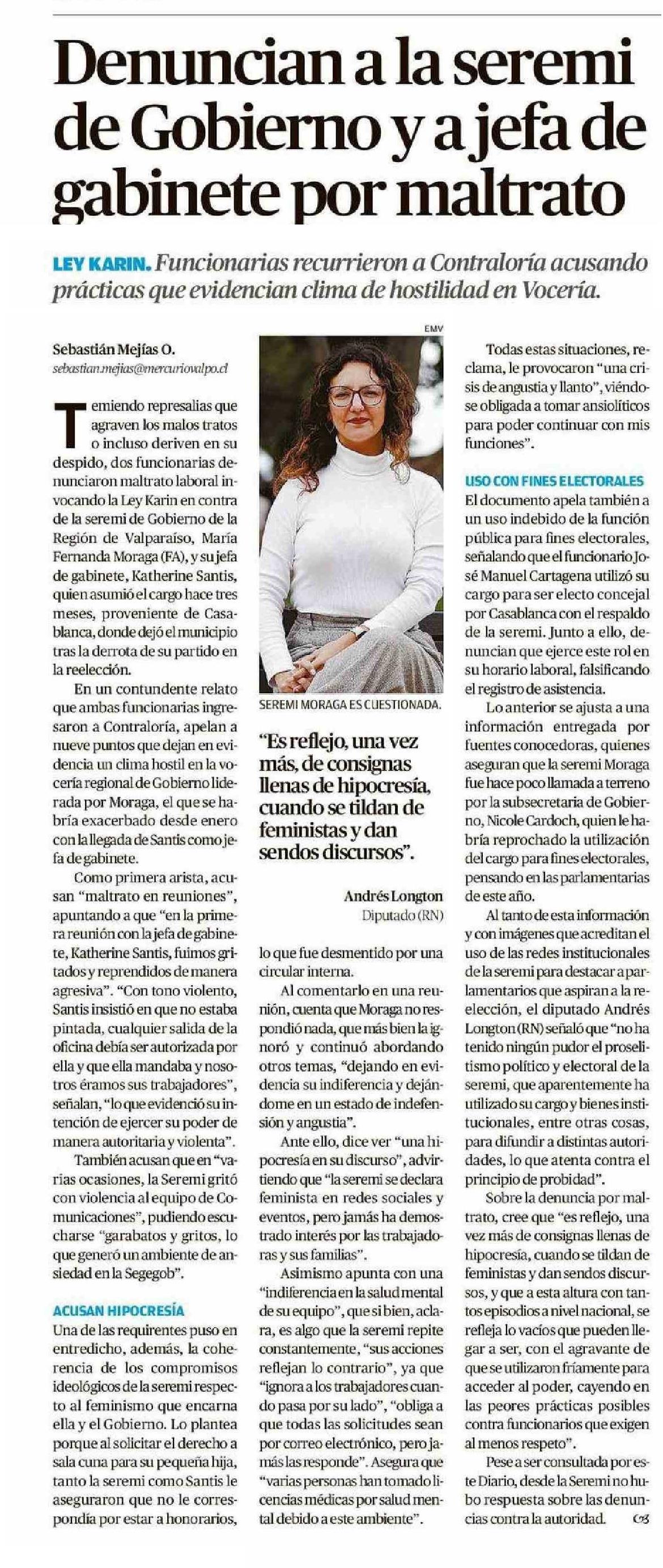 Denuncian a la seremi de Gobierno y a jefa de gabinete por maltrato 03-04-2025 El Mercurio de Valparaíso |