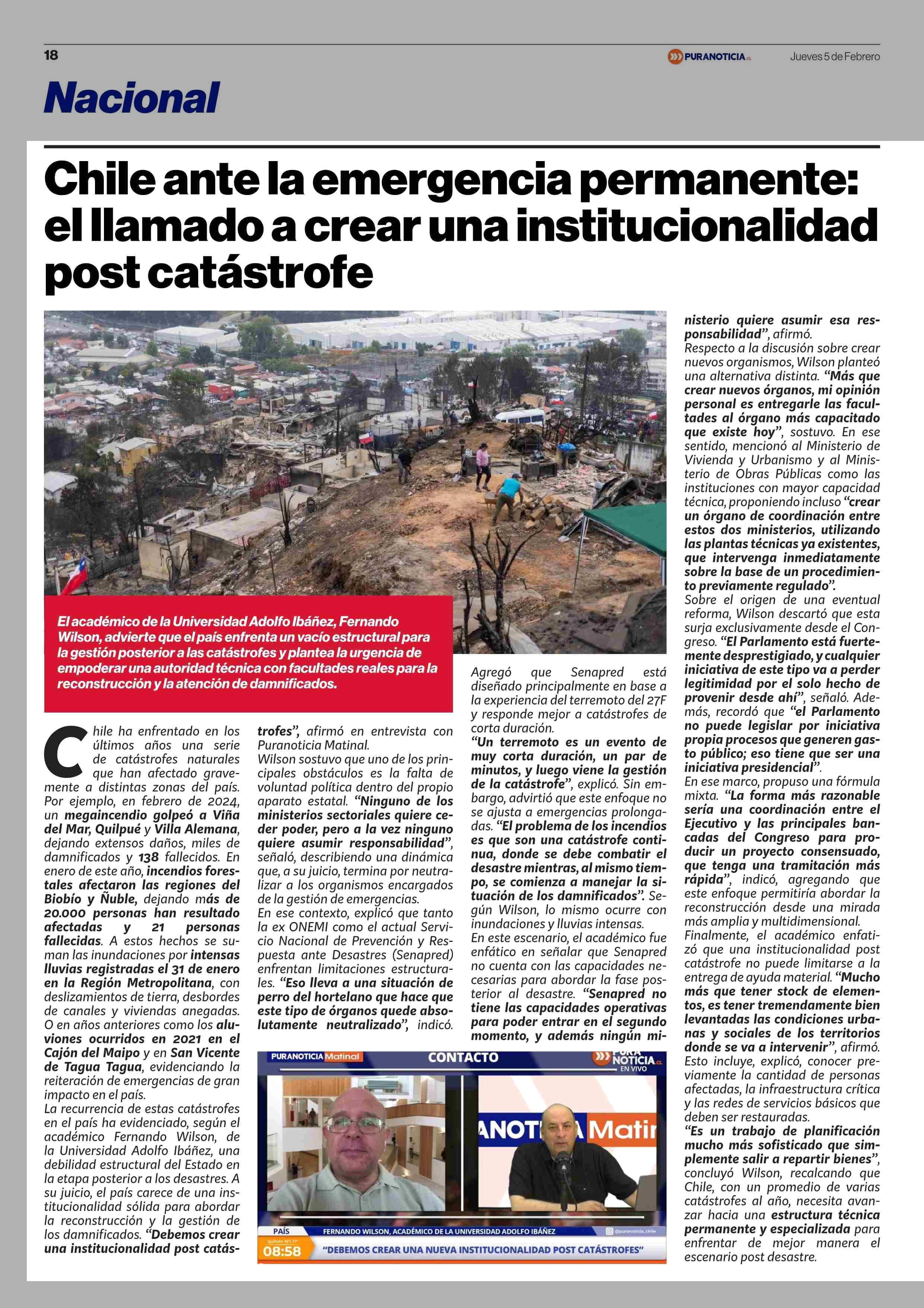 Chile ante la emergencia permanente: el llamado a crear una institucionalidad post catástrofe 05-02-2026 Puranoticia.cl |