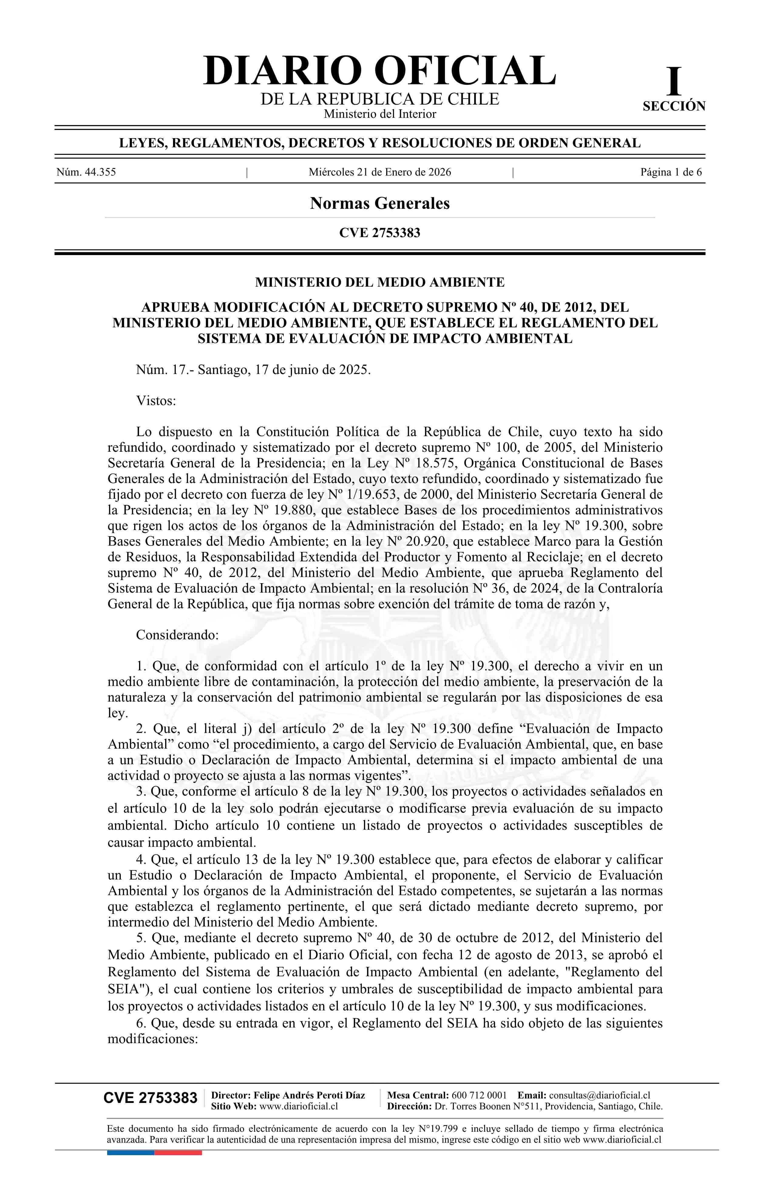 Título: Decreto número 17, de 2025.- Aprueba modificación al decreto Nº 40, de 2012, que establece el Reglamento del Sistema de Evaluación de Impacto Ambiental