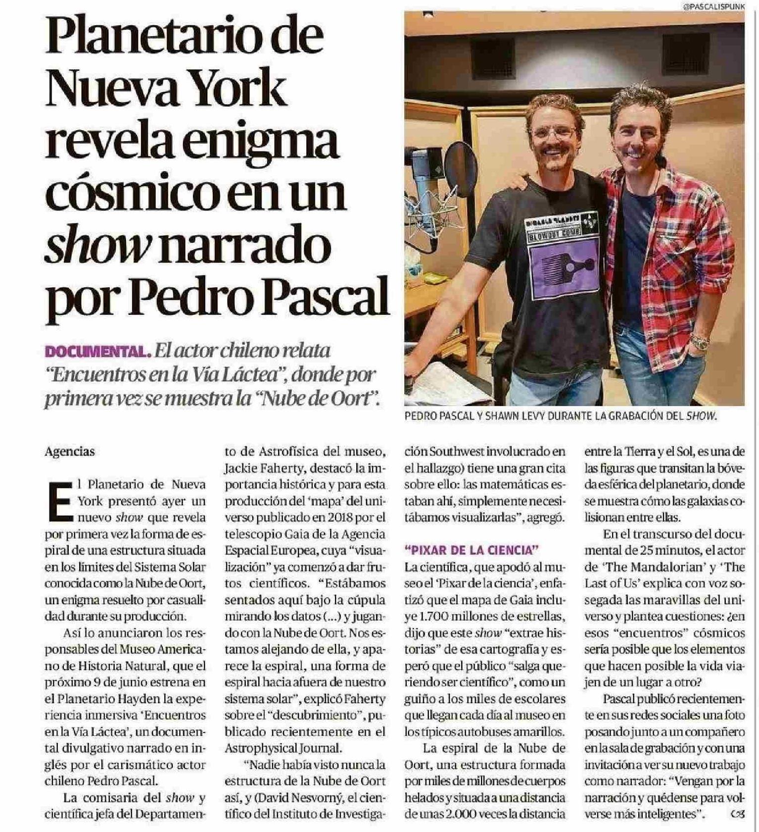 Planetario de Nueva York revela enigma cósmico en un show narrado por Pedro Pascal 04-06-2025 El Mercurio de Valparaíso |