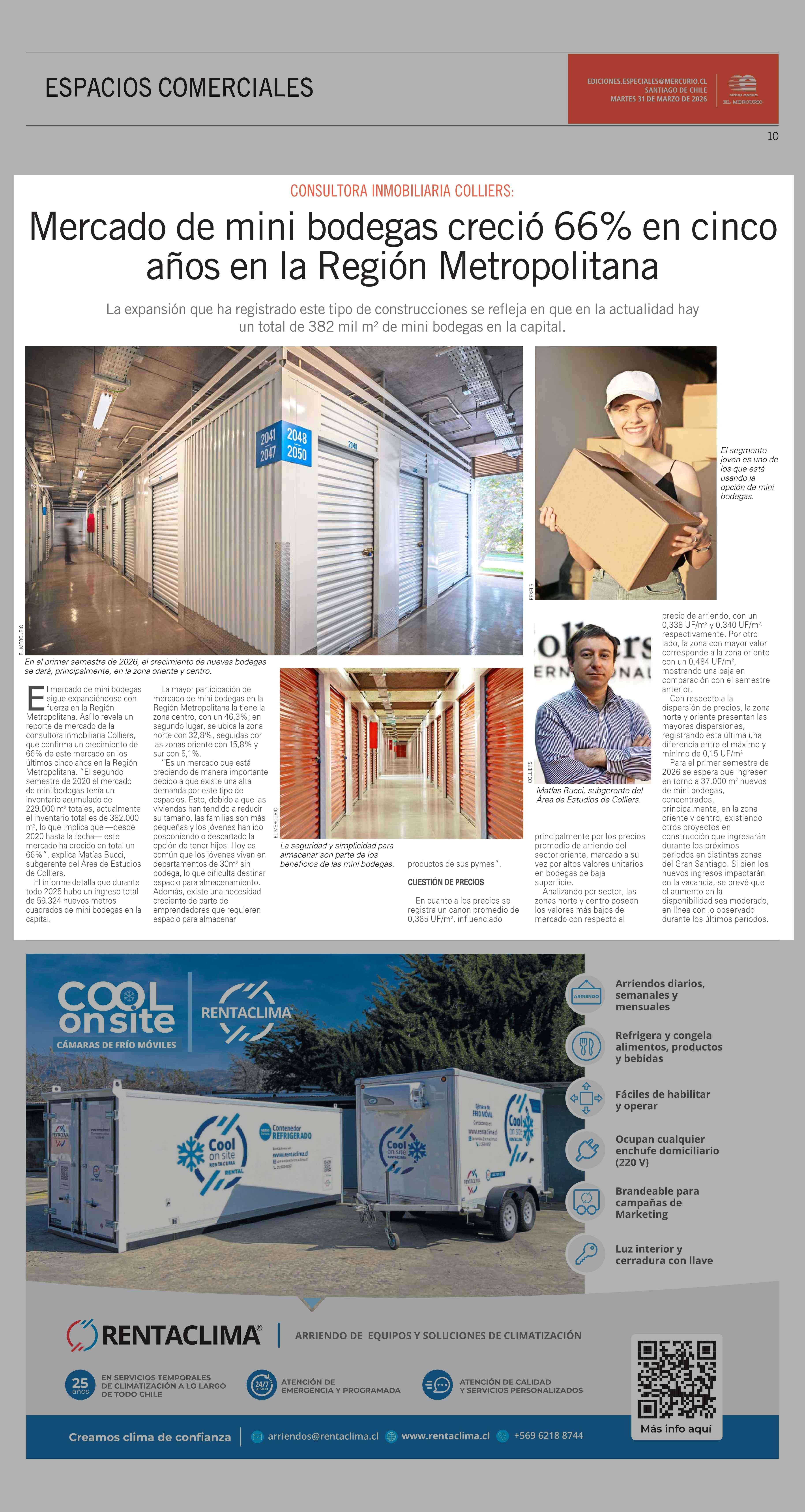 Mercado de mini bodegas creció 66% en cinco años en la Región Metropolitana 31-03-2026 El Mercurio |