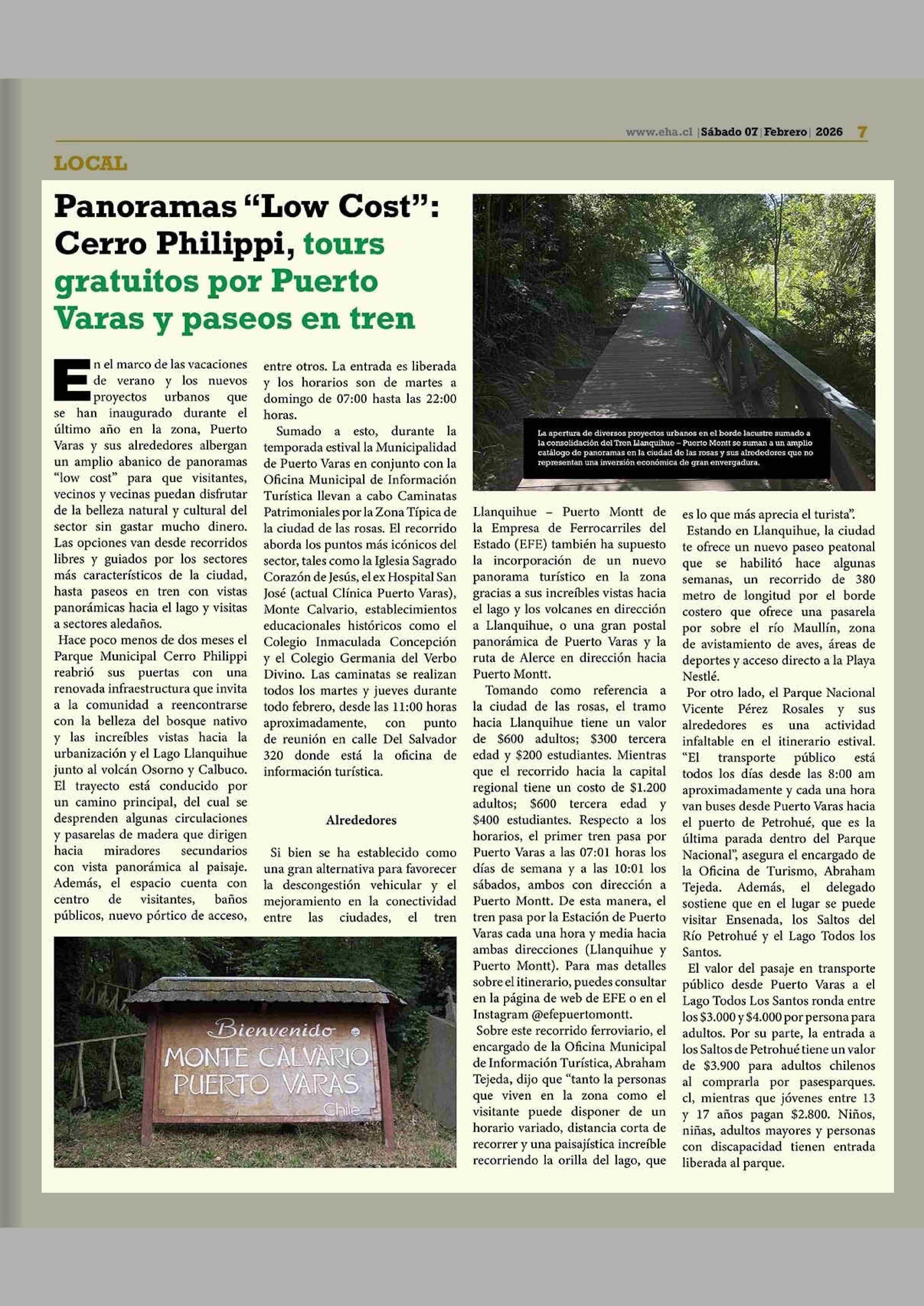 Panoramas "Low Cost": Cerro Philippi, tours gratuitos por Puerto Varas y paseos en tren 07-02-2026 El Heraldo Austral |