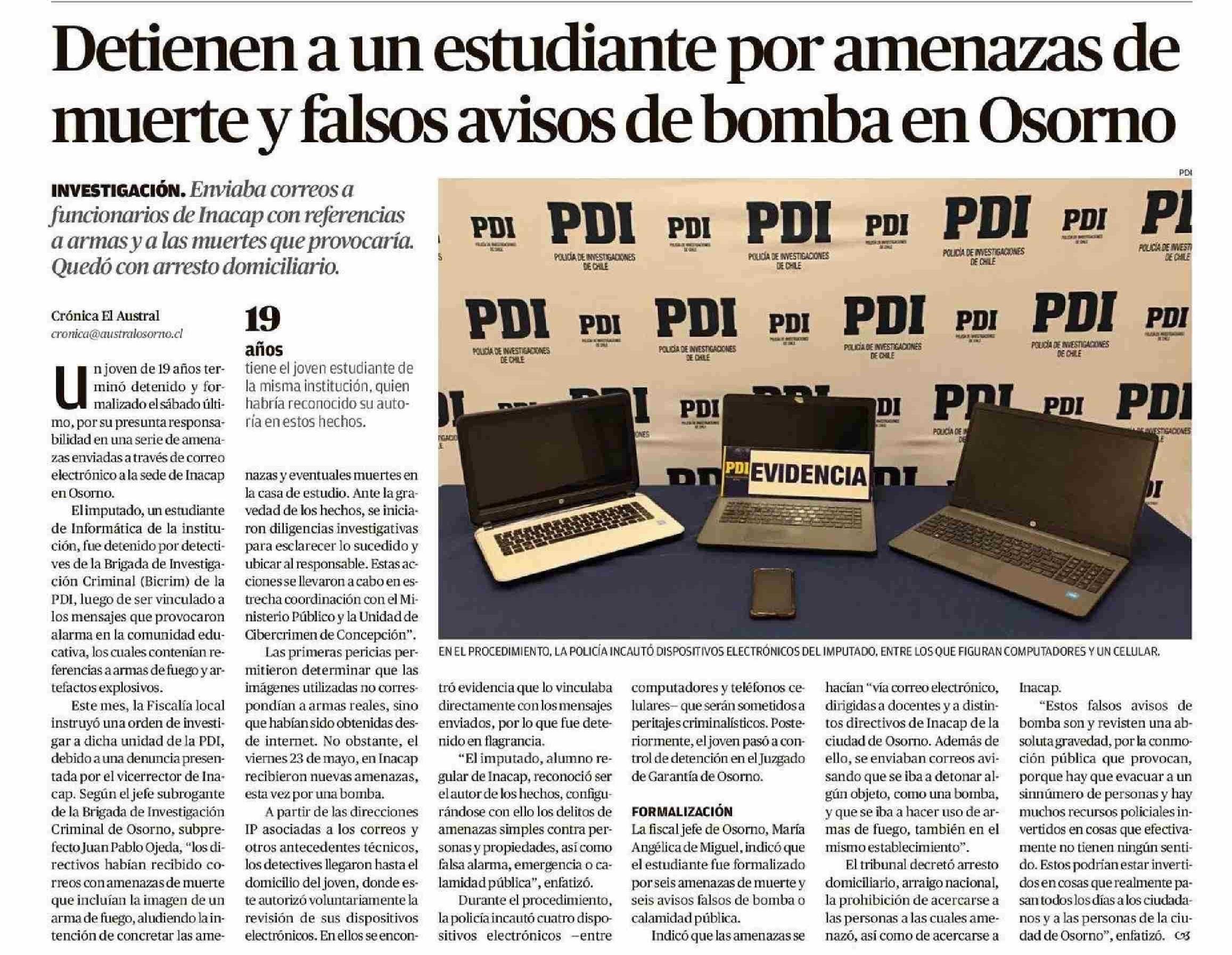 | Título: | Detienen a un estudiante por amenazas de muerte y falsos avisos de bomba en Osorno |