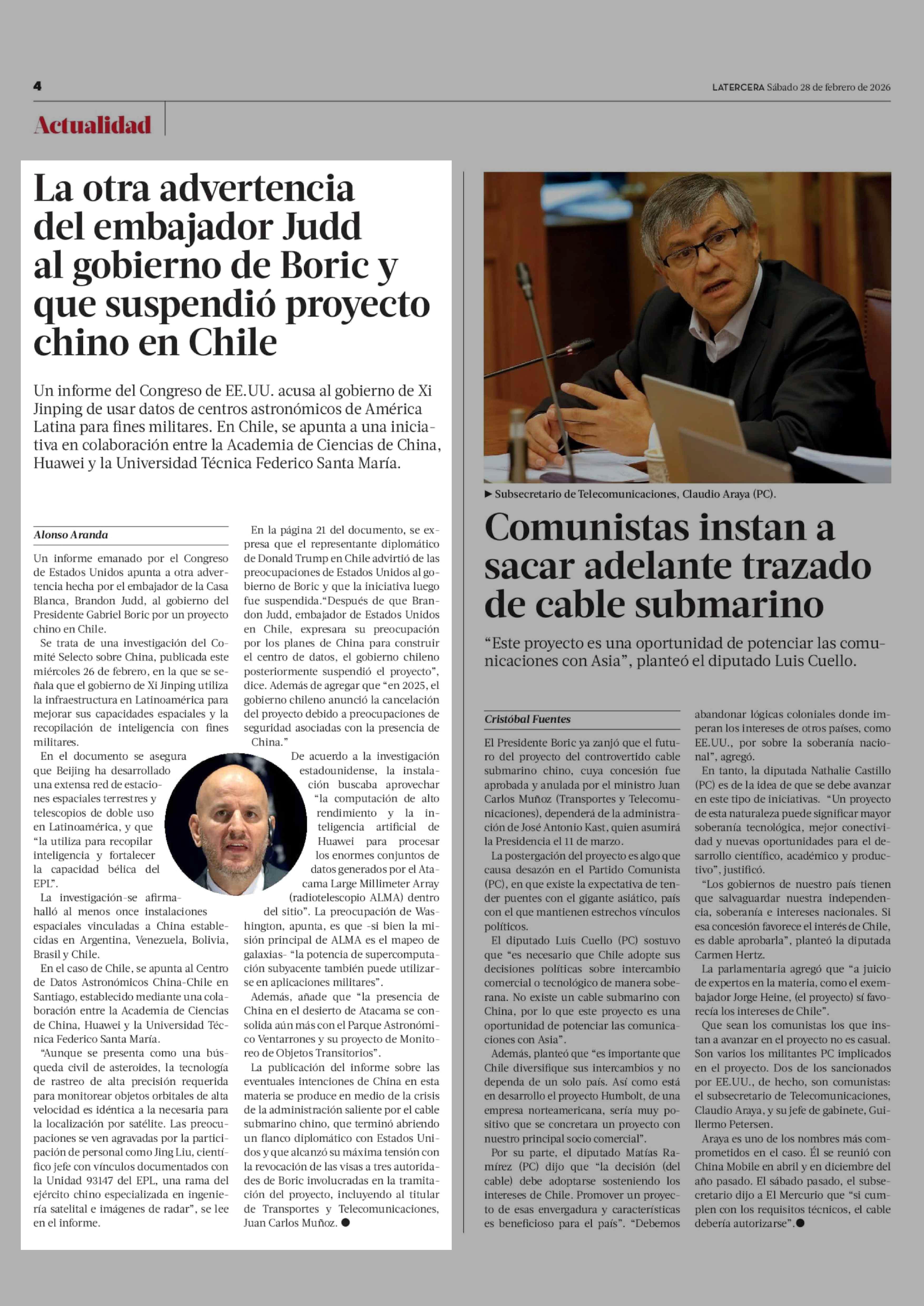 La otra advertencia del embajador Judd al gobierno de Boric y que suspendió proyecto chino en Chile 28-02-2026 La Tercera |