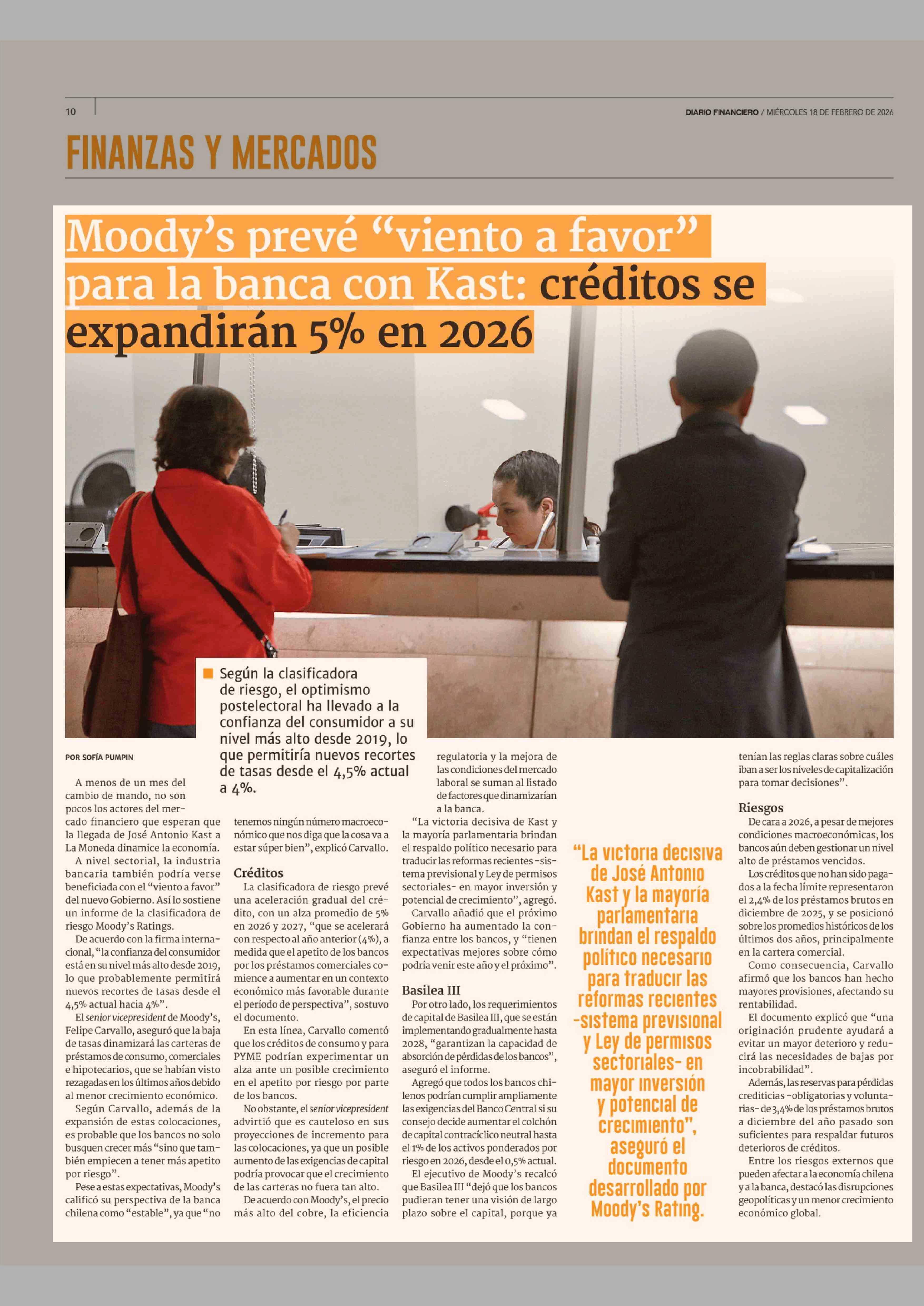 Moody's prevé "viento a favor para la banca con Kast: créditos se expandirán 5% en 2026 18-02-2026 Diario Financiero |