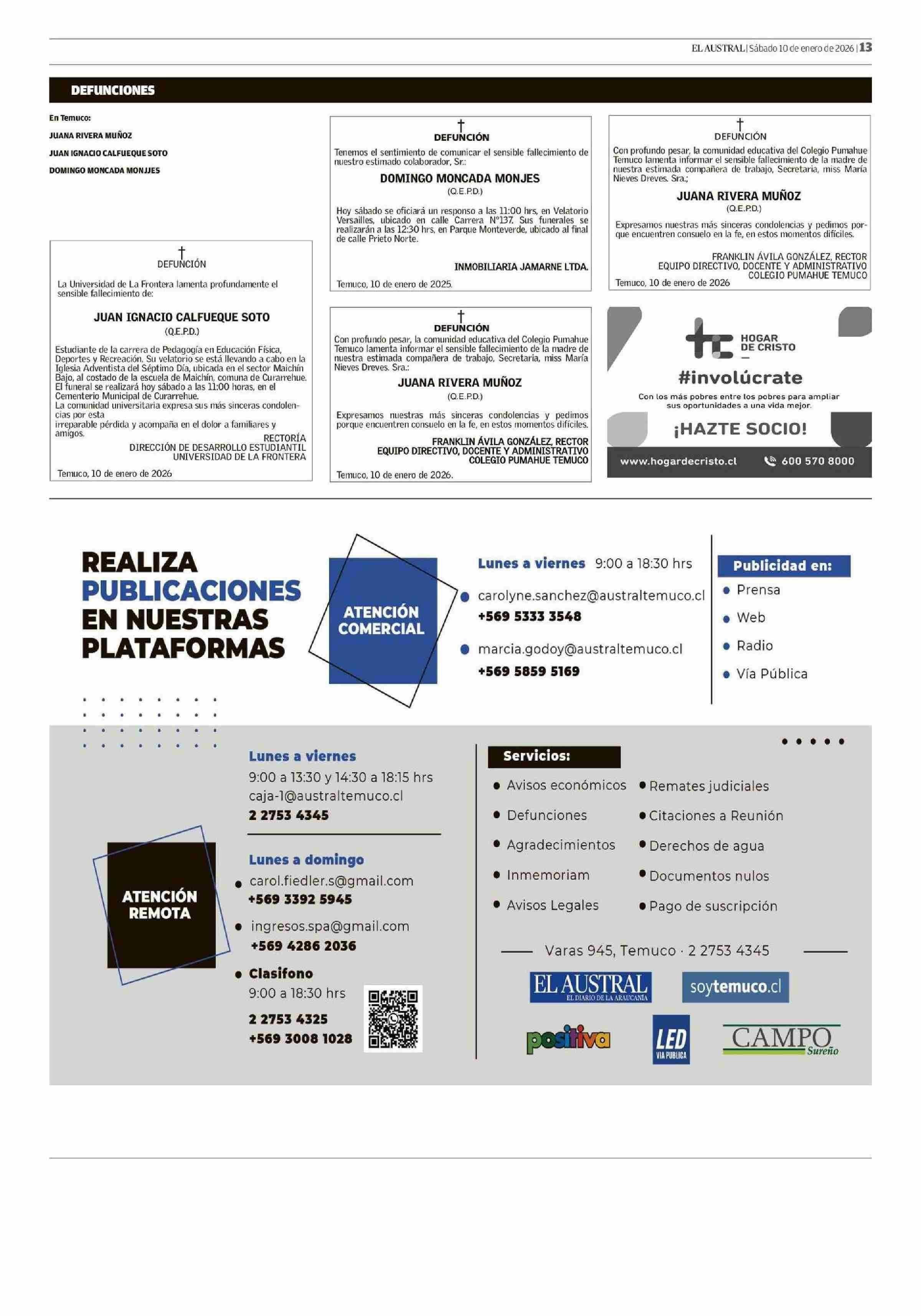 Obituario: + DEFUNCIÓN 10-01-2026 El Austral de la Araucanía |