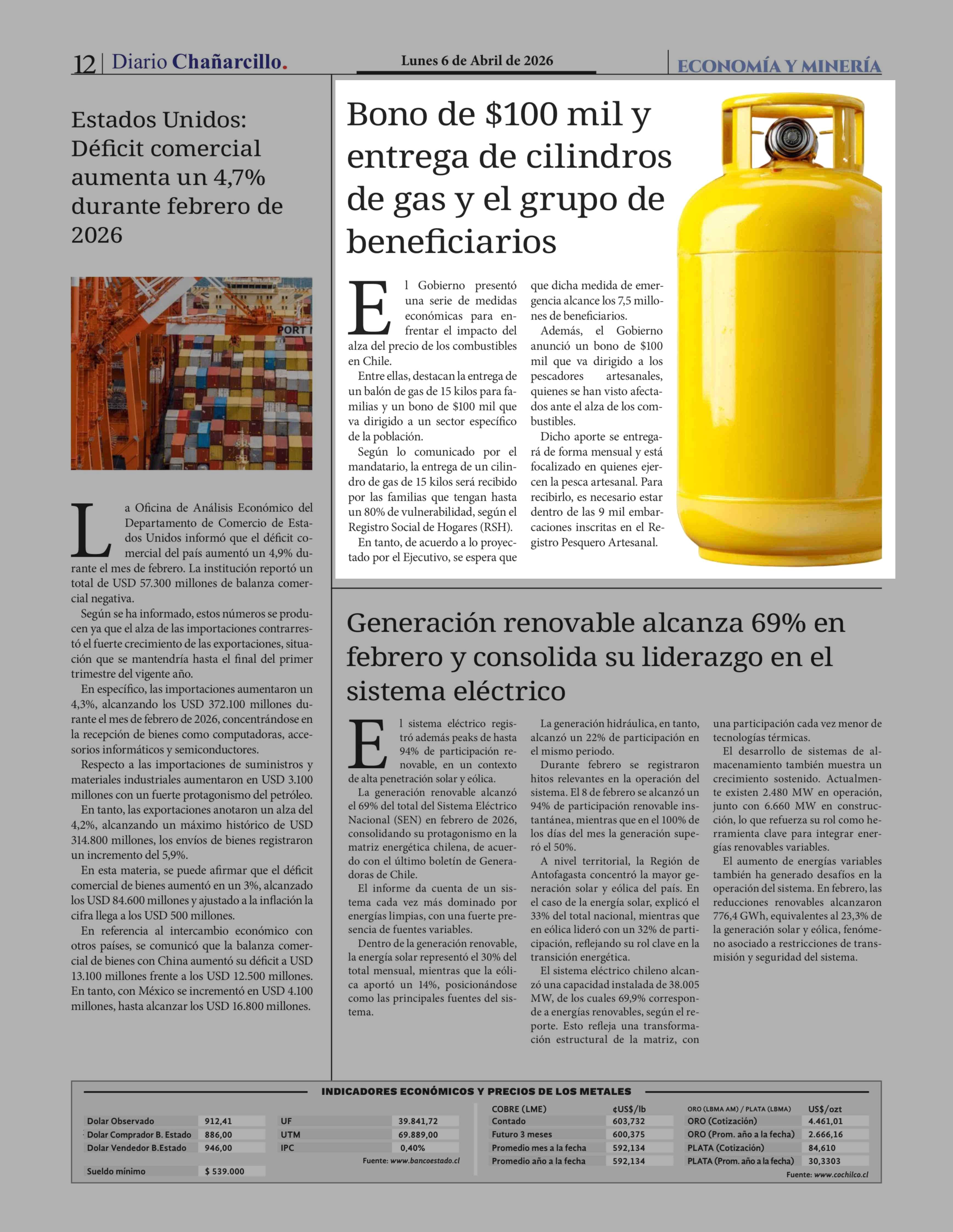 Bono de $100 mil y entrega de cilindros de gas y el grupo de beneficiarios 06-04-2026 Diario Chañarcillo |