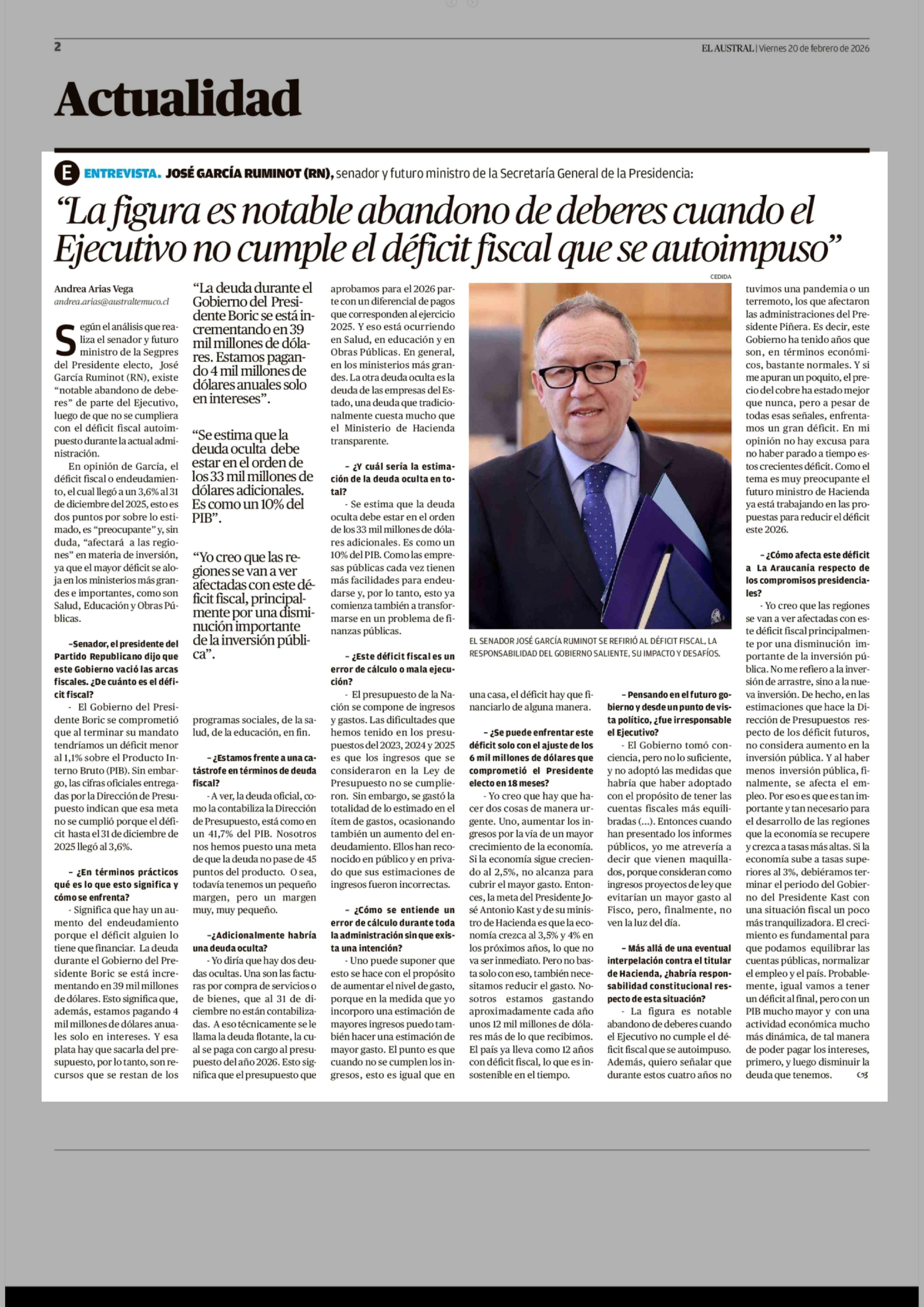 "La figura es notable abandono de deberes cuando el Ejecutivo no cumple el déficit fiscal que se autoimpuso" 20-02-2026 El Austral de la Araucanía |