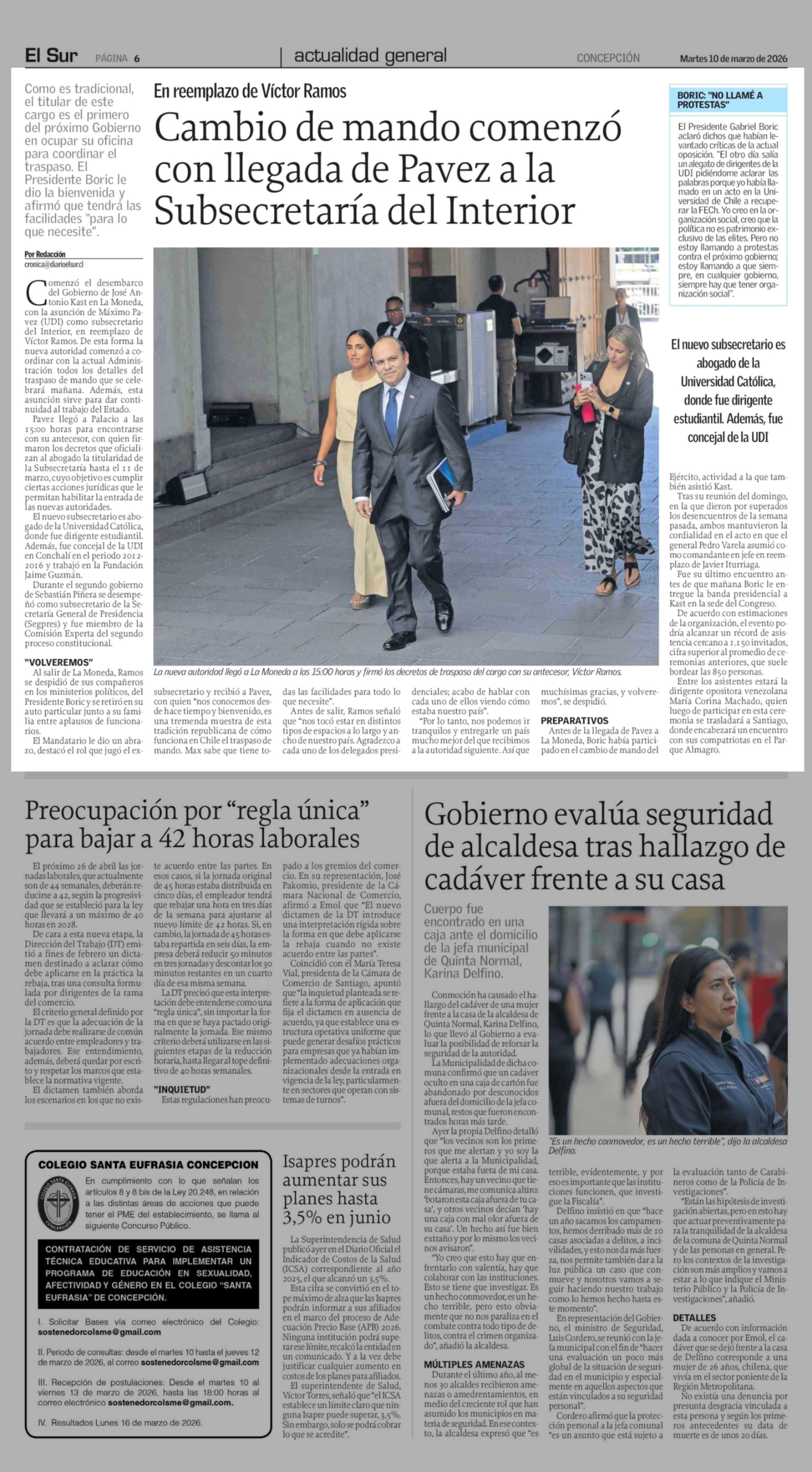 Cambio de mando comenzó con llegada de Pavez a la Subsecretaría del Interior 10-03-2026 El Sur |