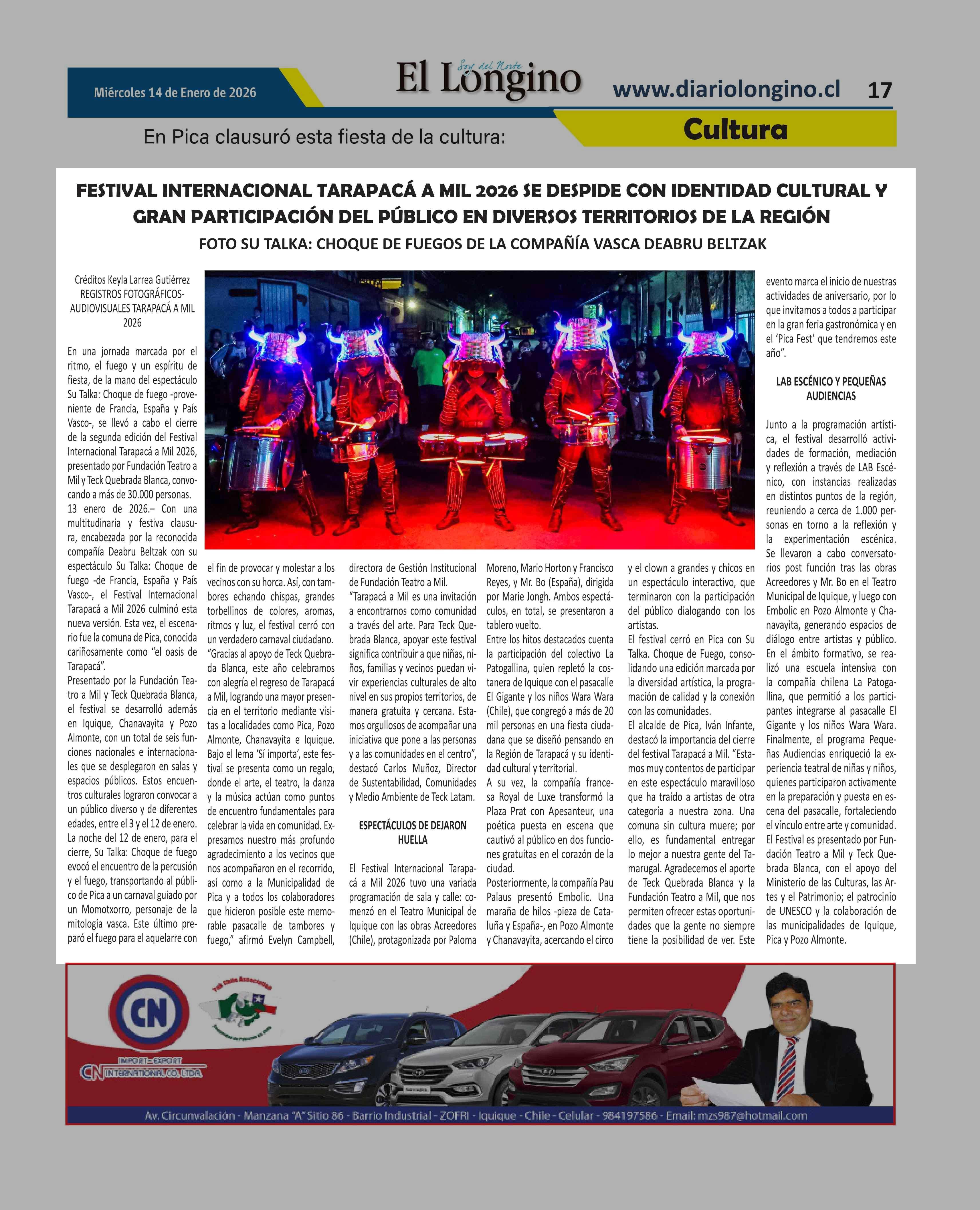 | Título: | FESTIVAL INTERNACIONAL TARAPACÁ A MIL 2026 SE DESPIDE CON IDENTIDAD CULTURAL Y GRAN PARTICIPACIÓN DEL PÚBLICO EN DIVERSOS TERRITORIOS DE LA REGIÓN FOTO SU TALKA: CHOQUE DE FUEGOS DE LA COMPAÑÍA VASCA DEABRU BELTZAK |