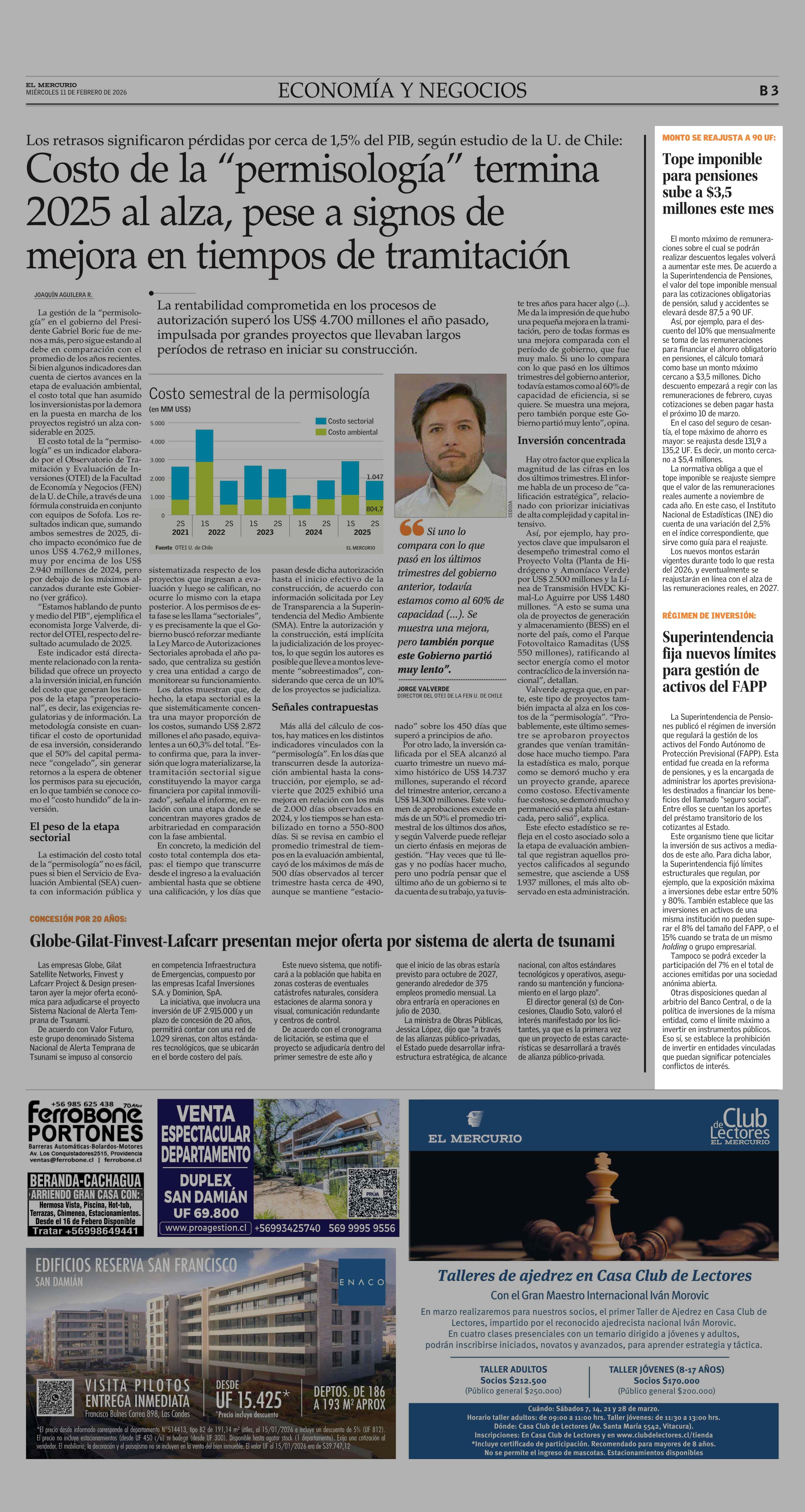 Tope imponible para pensiones sube a $3,5 millones este mes 11-02-2026 El Mercurio |