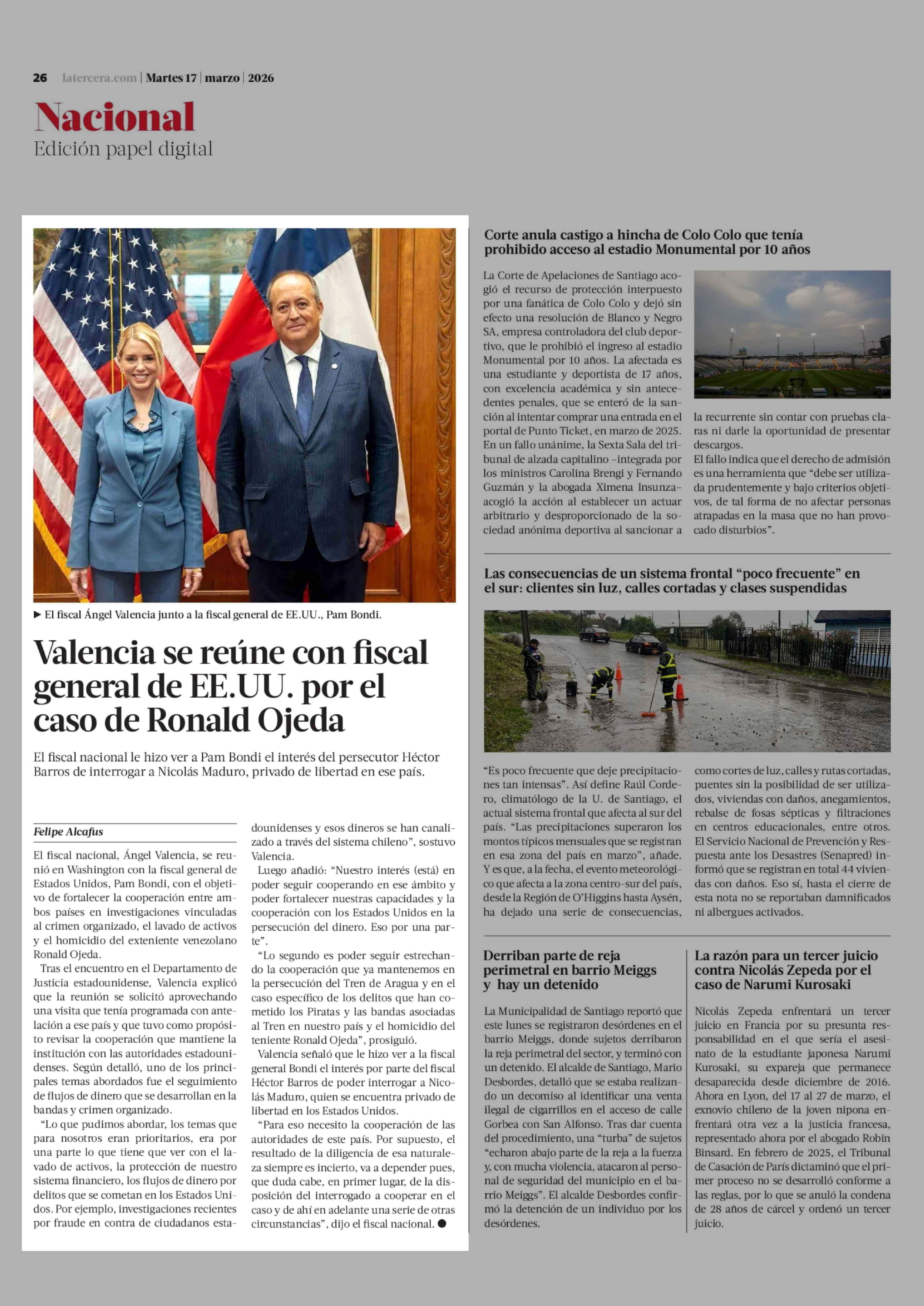 Valencia se reúne con fiscal general de EE.UU. por el caso de Ronald Ojeda 17-03-2026 La Tercera |