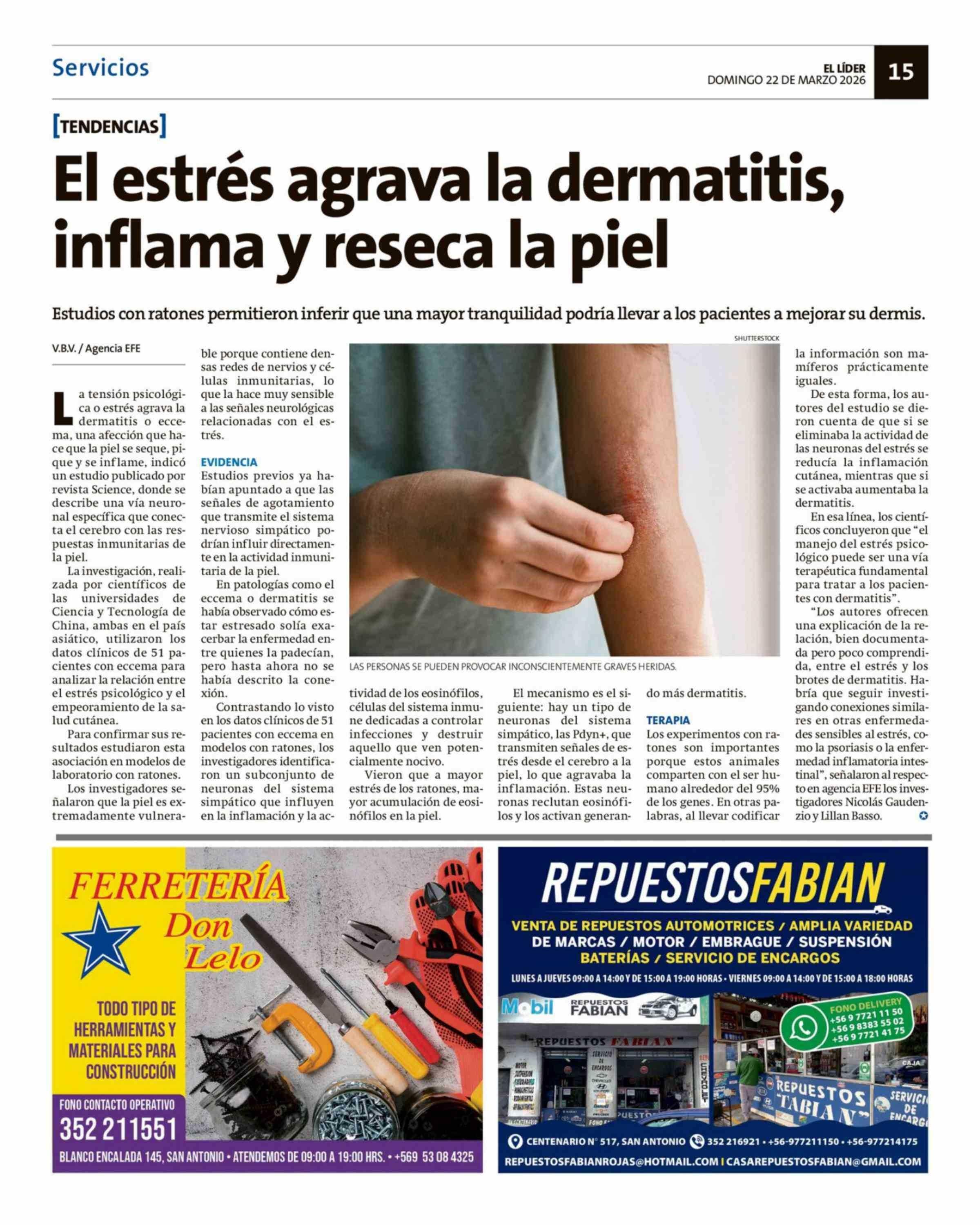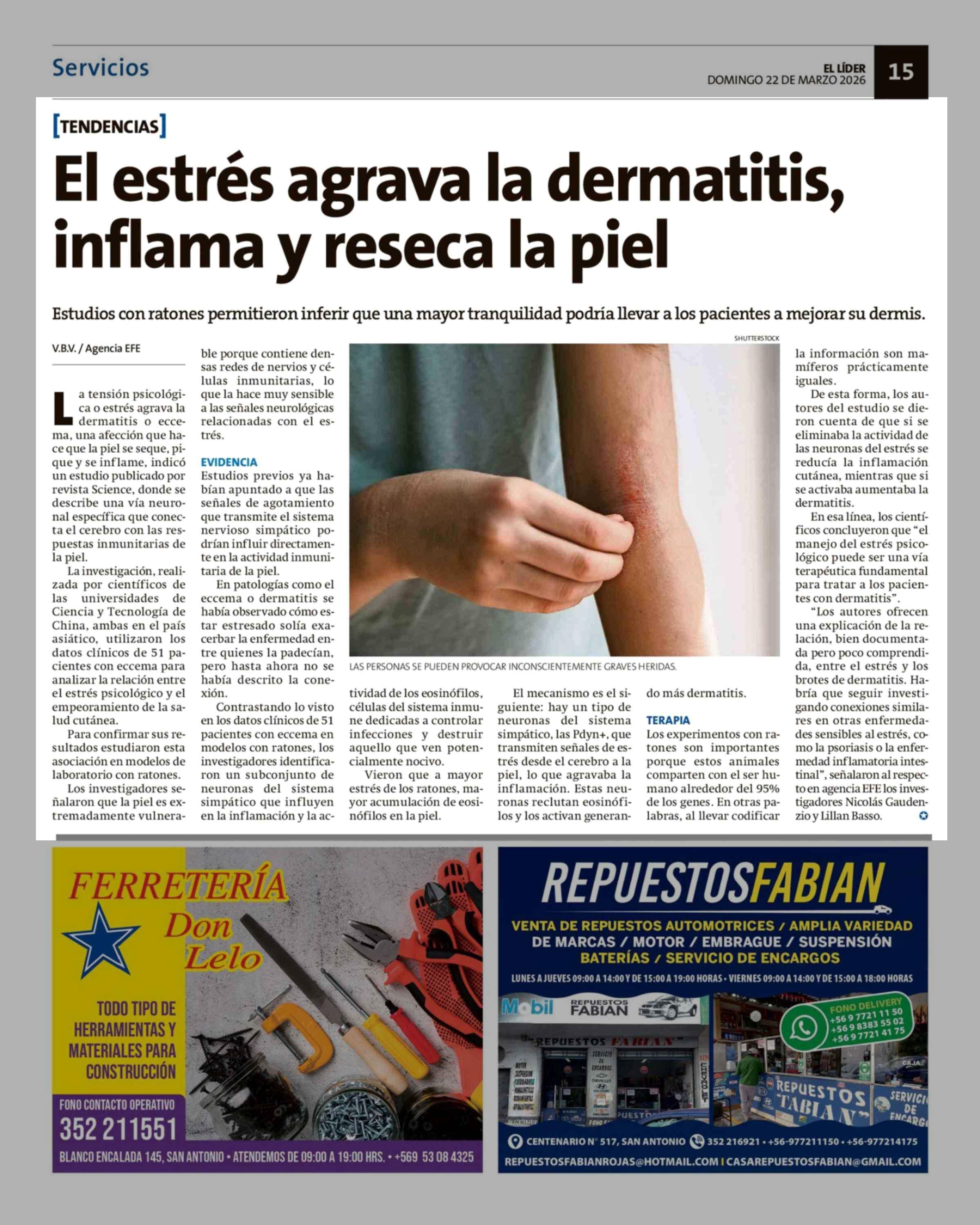 El estrés agrava la dermatitis, inflama y reseca la piel 22-03-2026 El Líder |