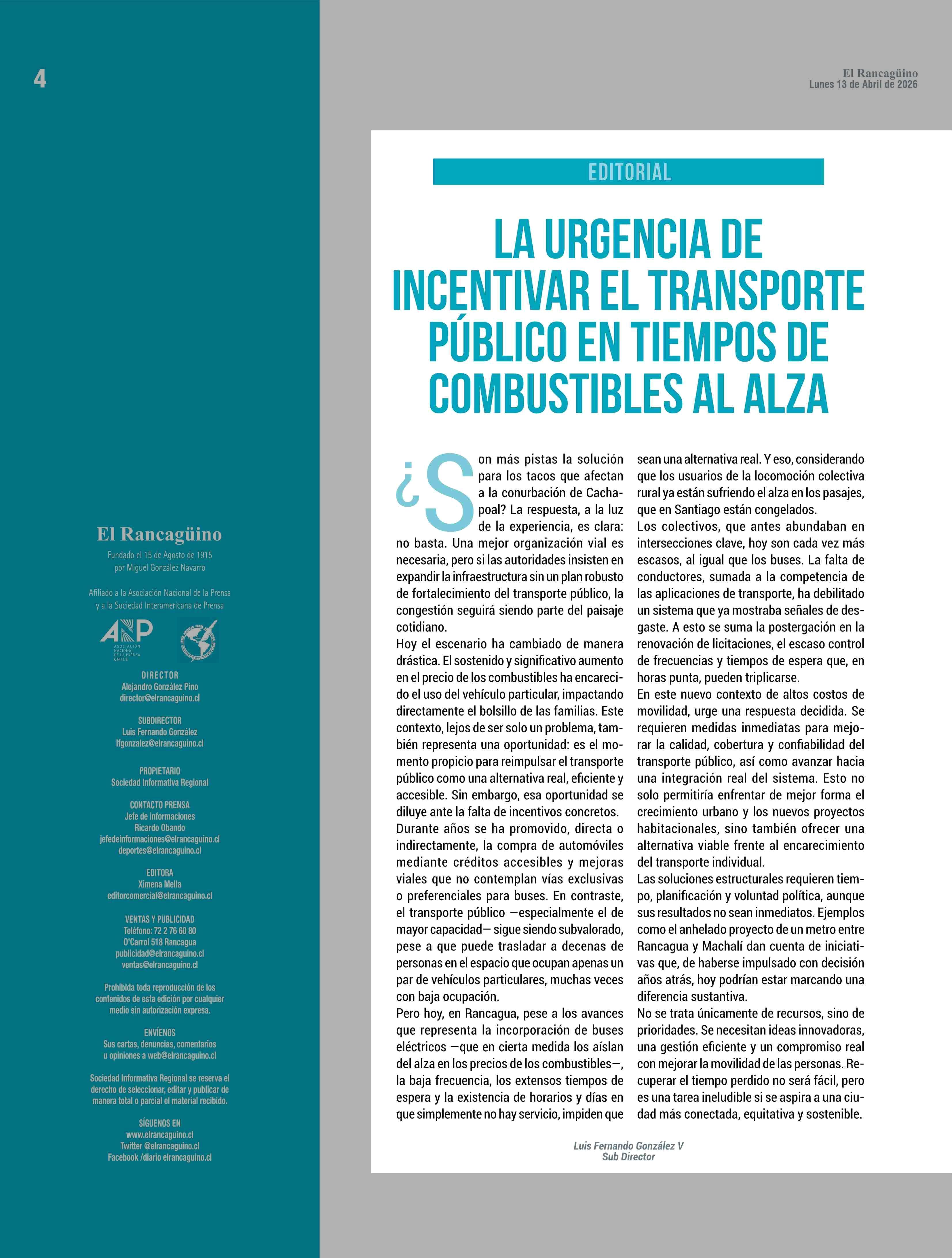 EDITORIAL: 13-04-2026 El Rancagüino |
