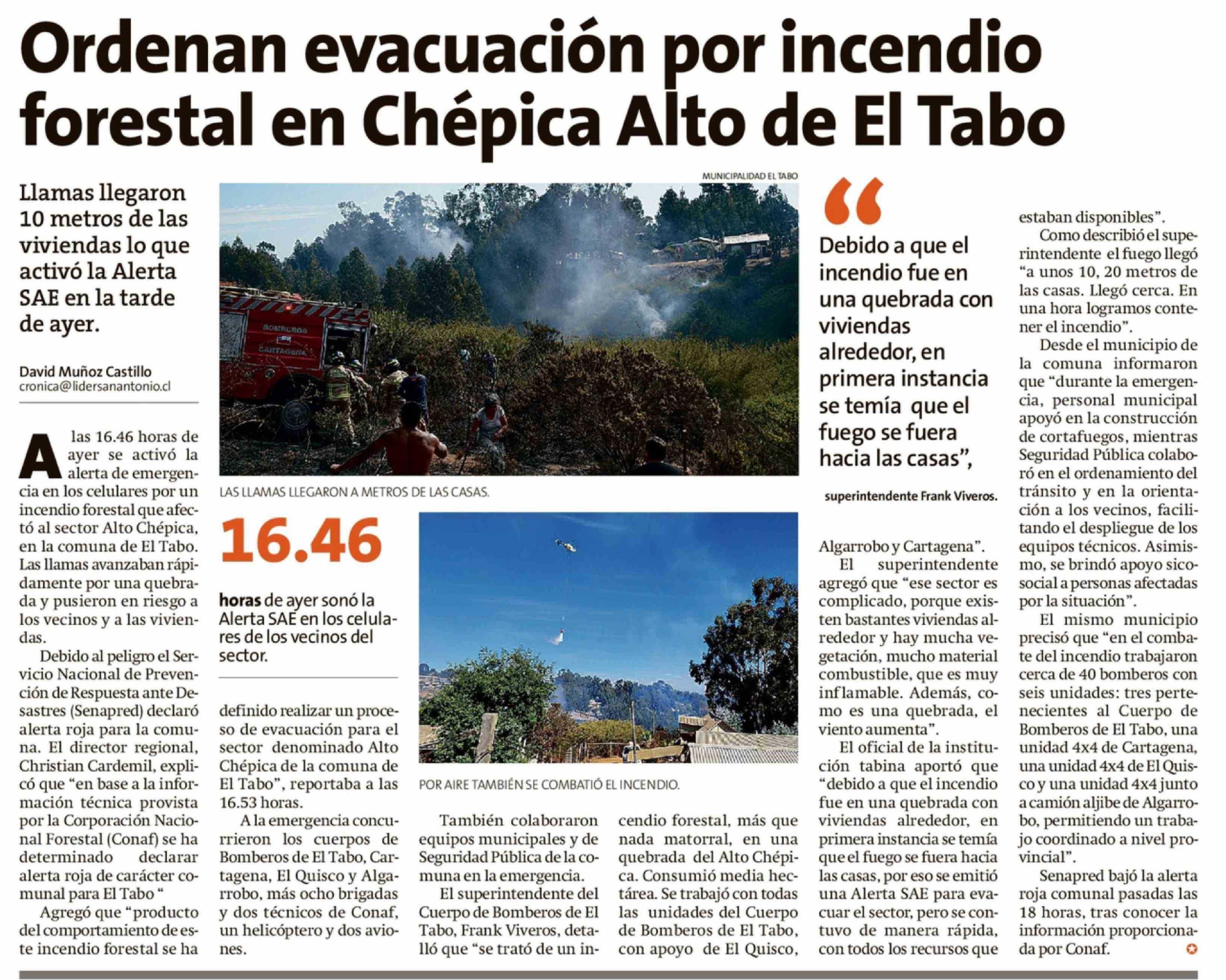 Ordenan evacuación por incendio forestal en Chépica Alto de El Tabo 28-02-2026 El Líder |