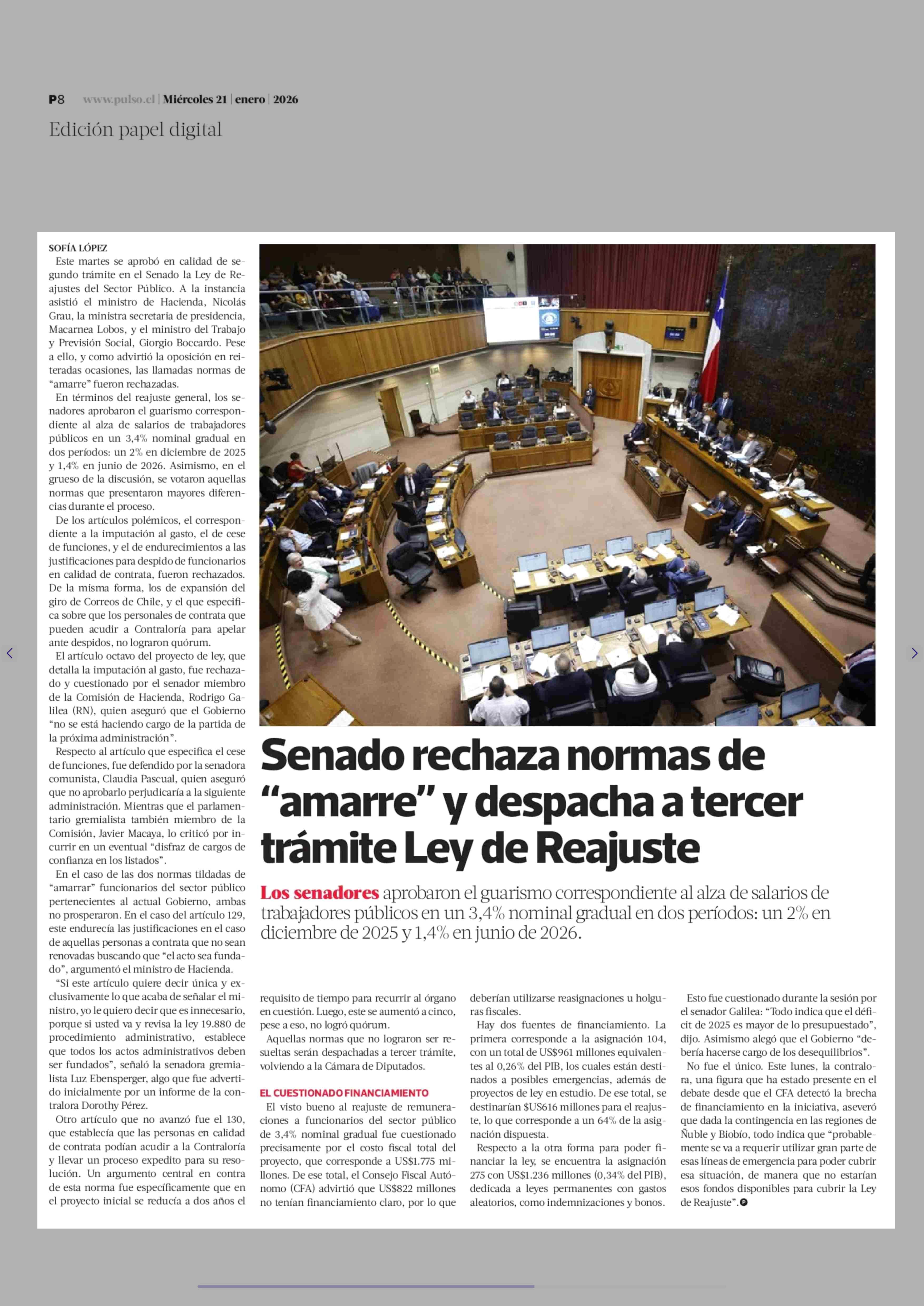 | Título: | Senado rechaza normas de "amarre" y despacha a tercer trámite Ley de Reajuste |