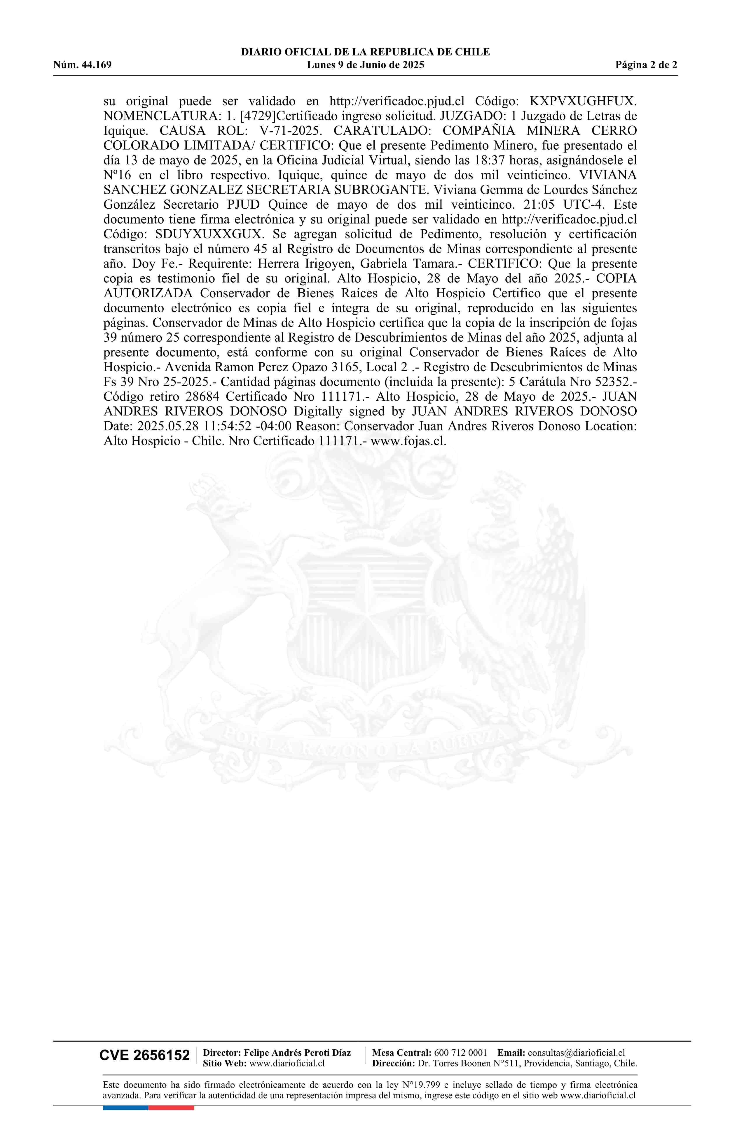 CARO 14 / Compañía Minera Cerro Colorado Limitada 09-06-2025 DIARIO OFICIAL CHILE - BOLETÍN OFICIAL DE MINERÍA |