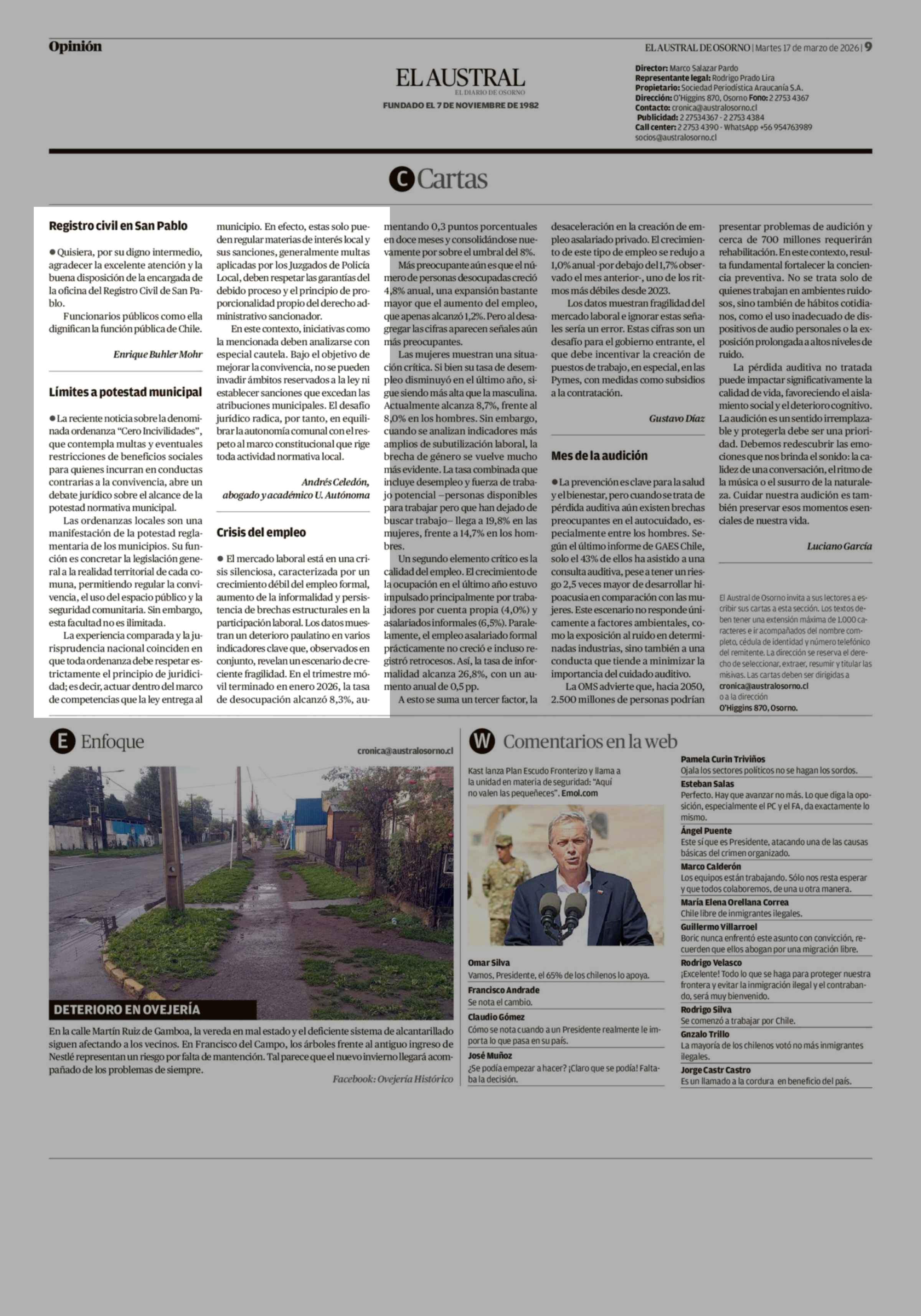 Cartas: Límites a potestad municipal 17-03-2026 El Austral de Osorno |