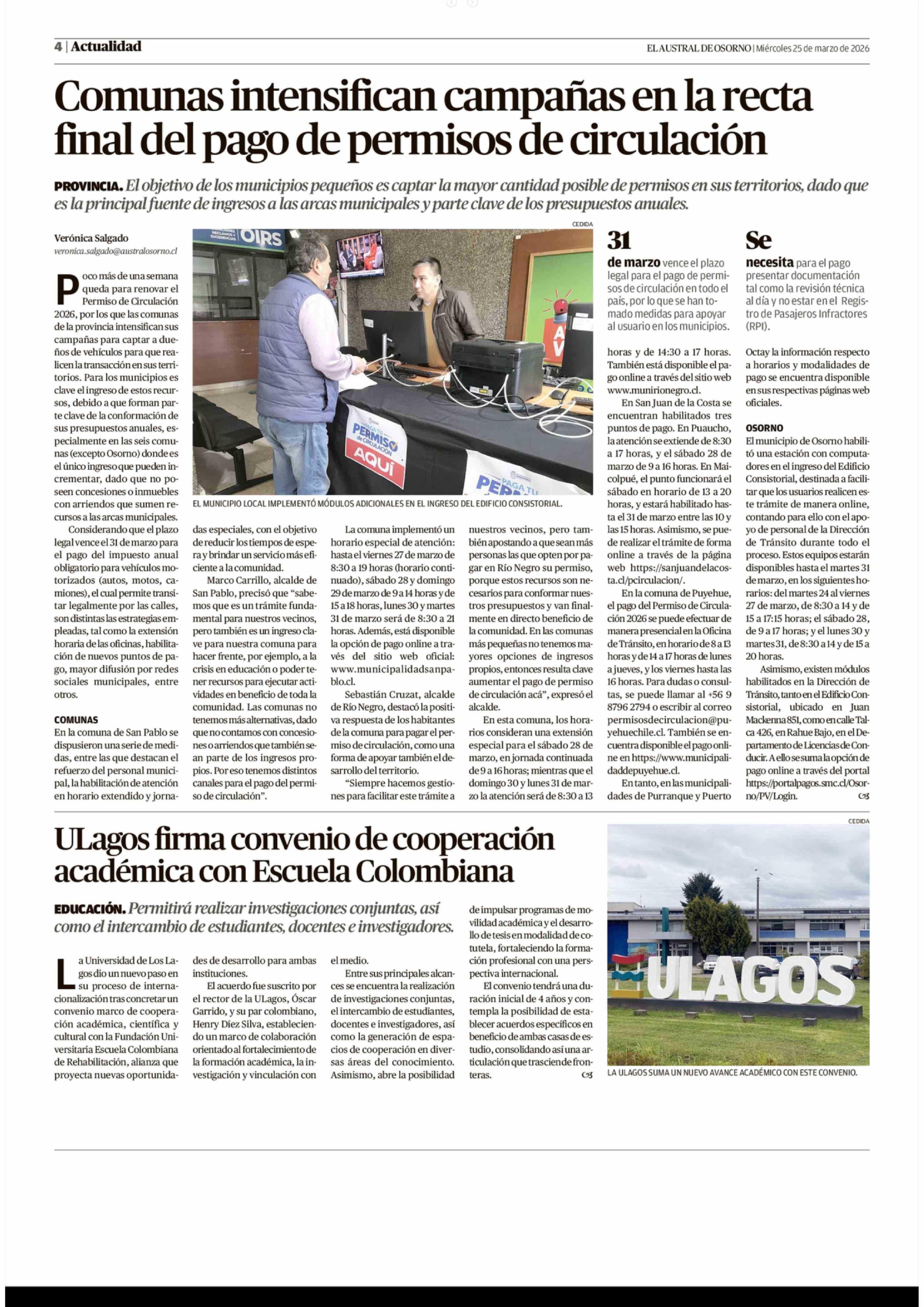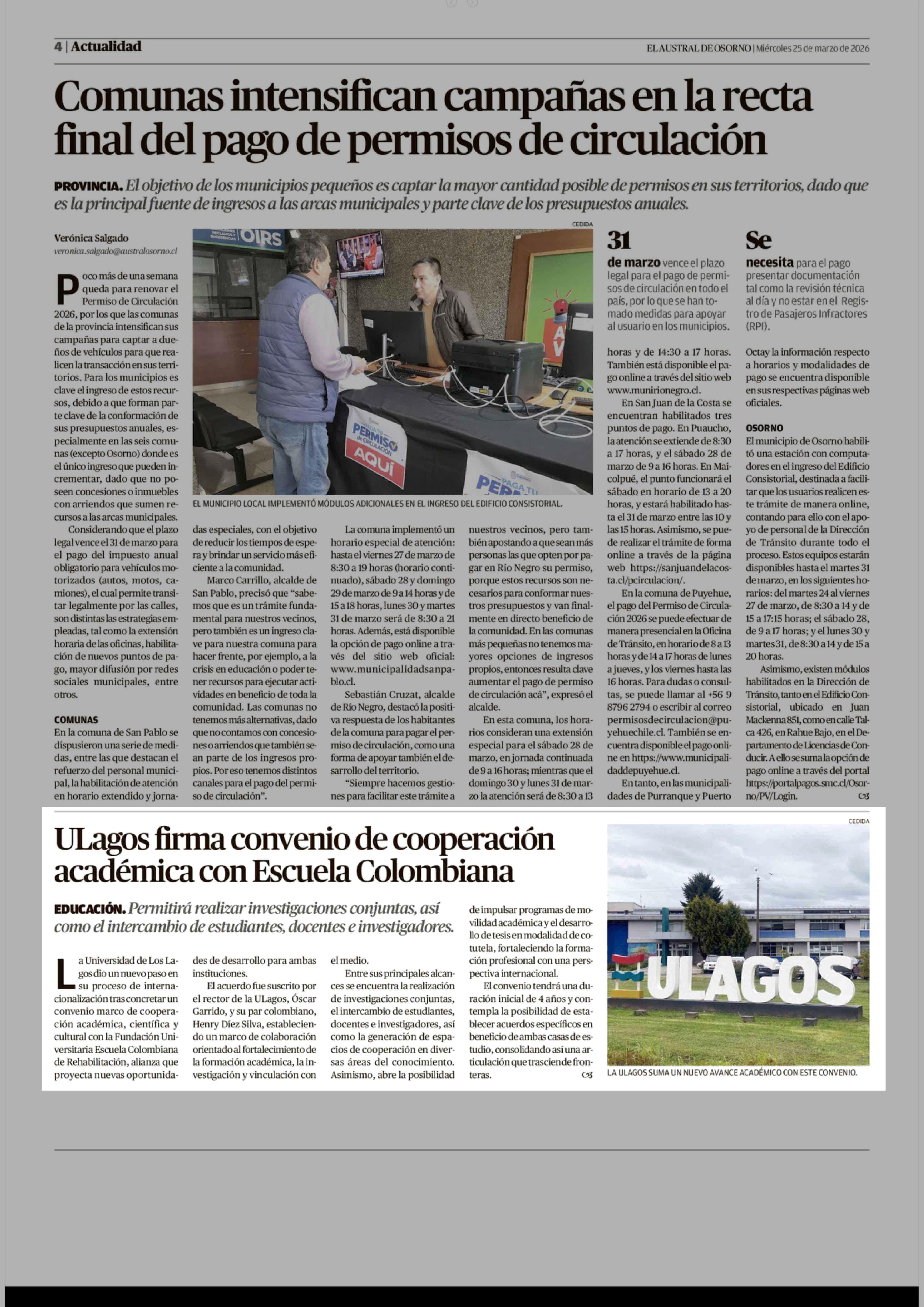 ULagos firma convenio de cooperación académica con Escuela Colombiana 25-03-2026 El Austral de Osorno |