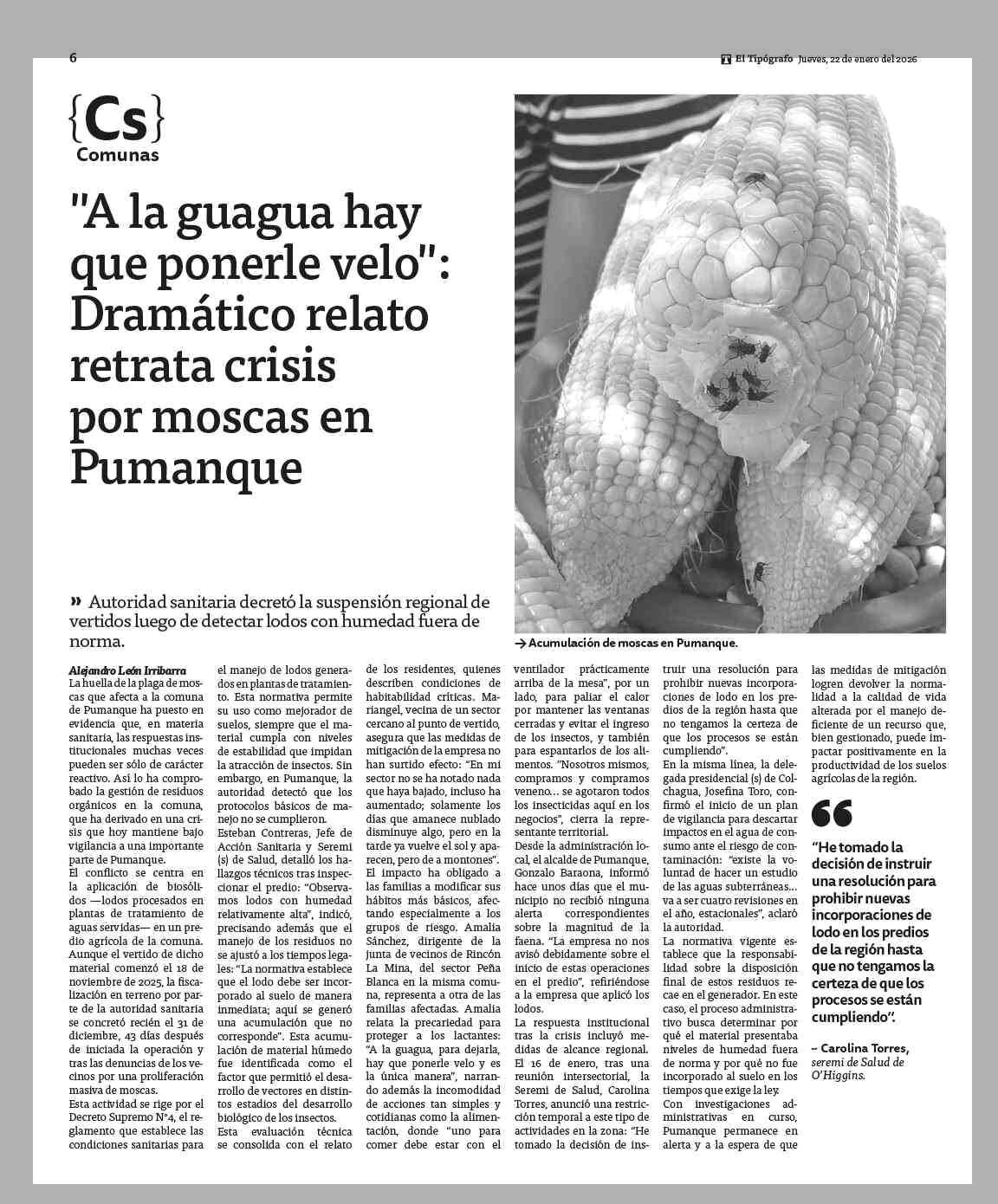 "A la guagua hay que ponerle velo": Dramático relato retrata crisis por moscas en Pumanque 22-01-2026 El Tipógrafo |