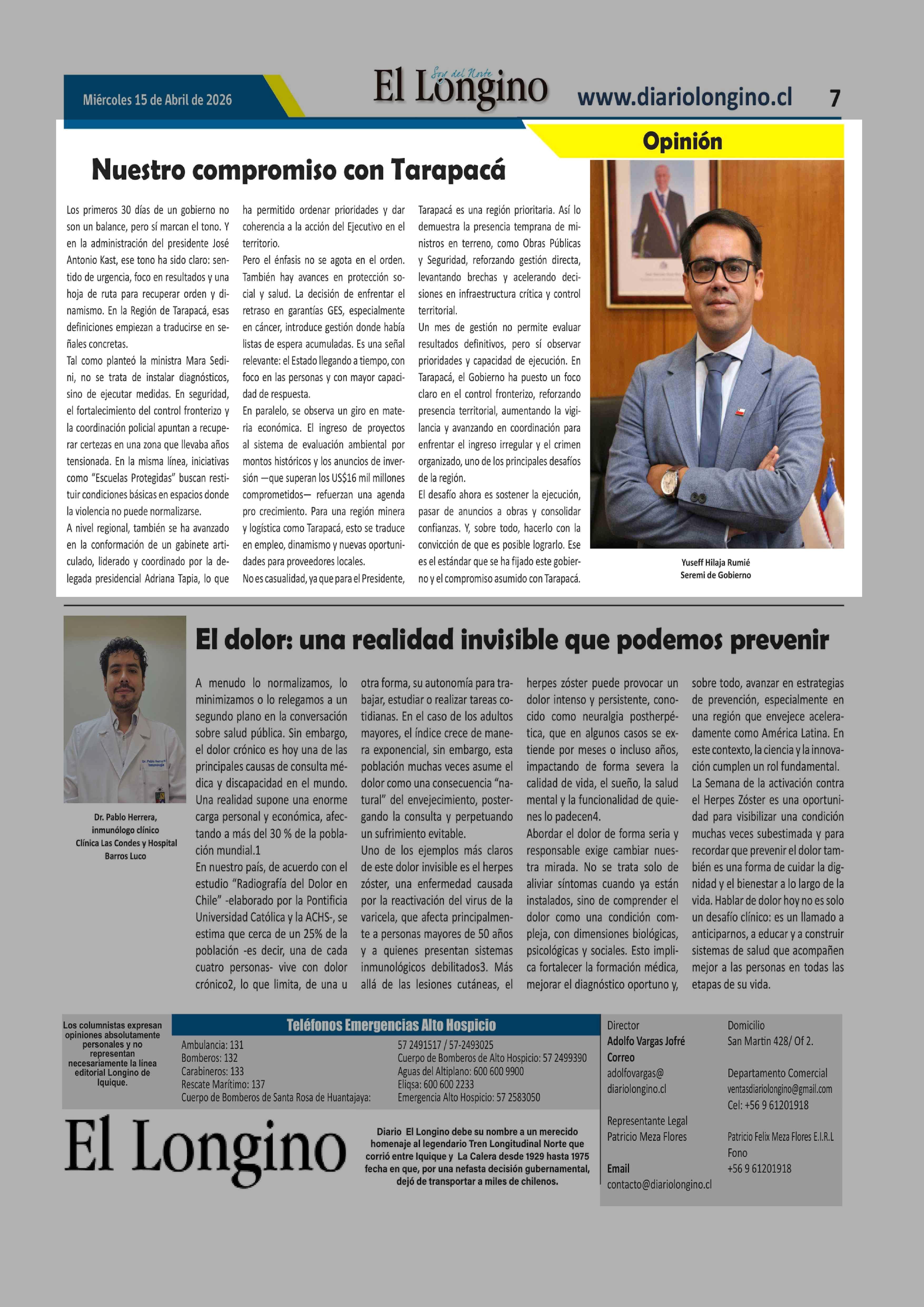 Columnas de Opinión: Nuestro compromiso con Tarapacá 15-04-2026 El Longino |