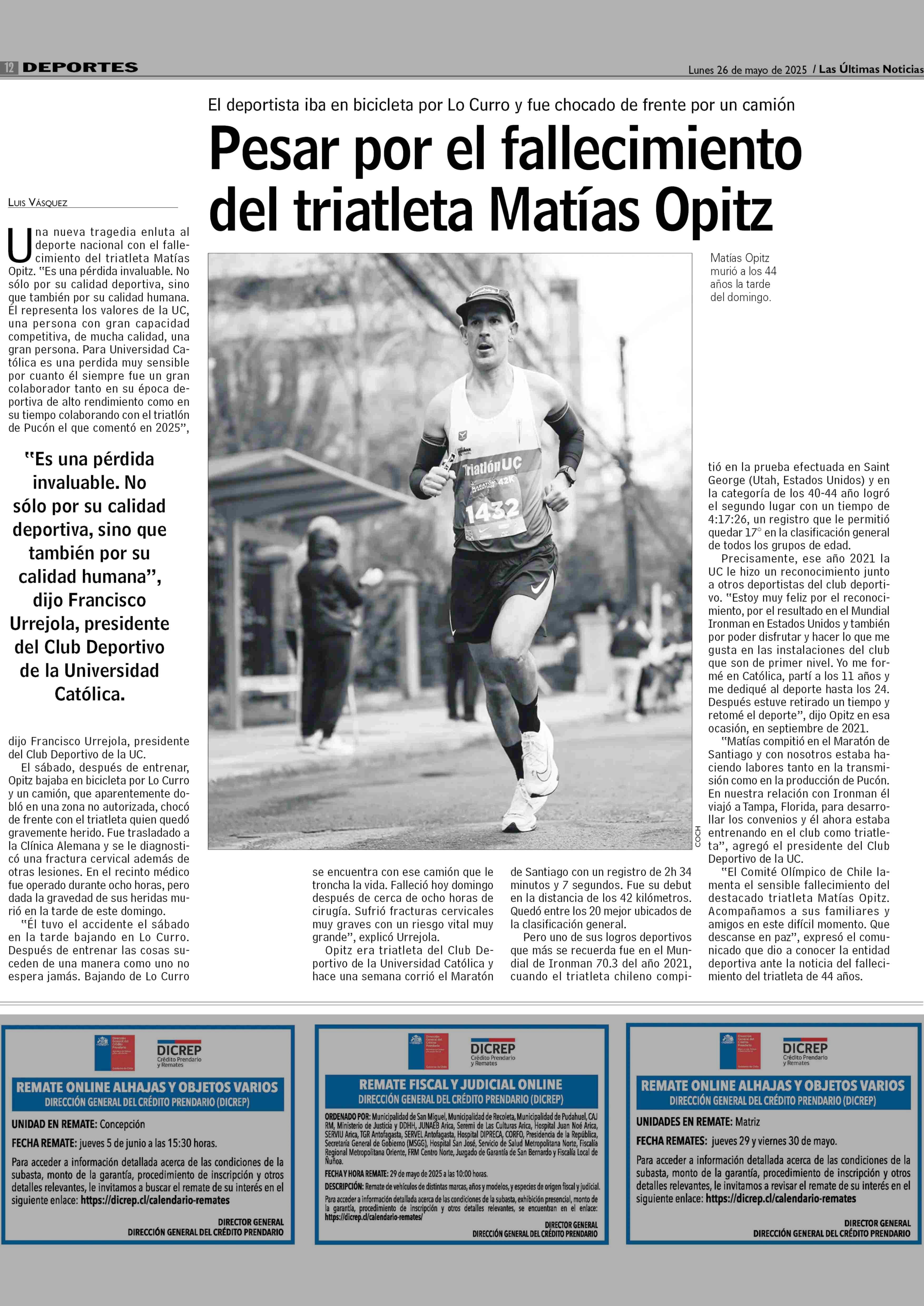 Título: Pesar por el fallecimiento del triatleta Matias Oprtz