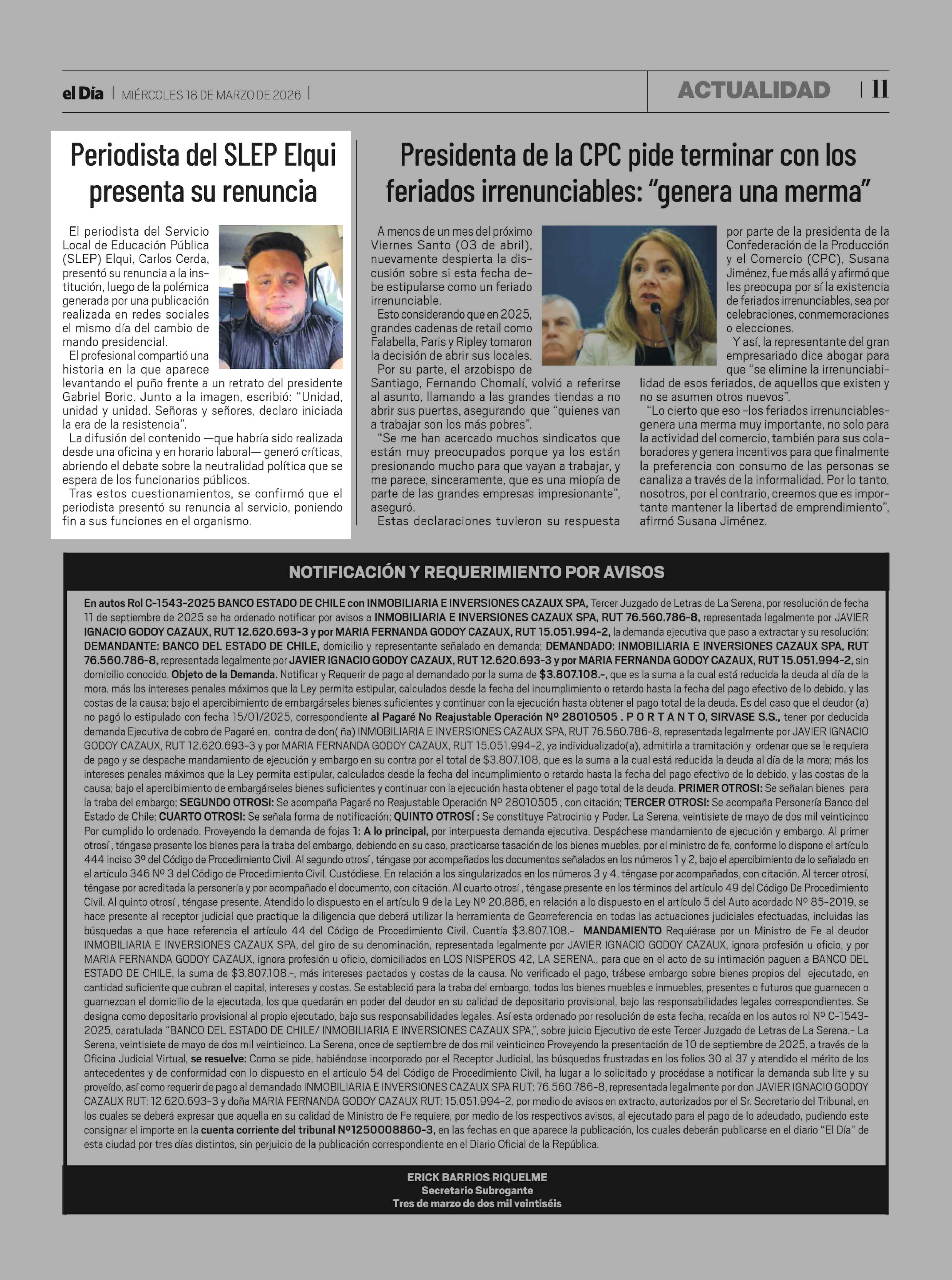 Periodista del SLEP Elqui presenta su renuncia 18-03-2026 El Día |