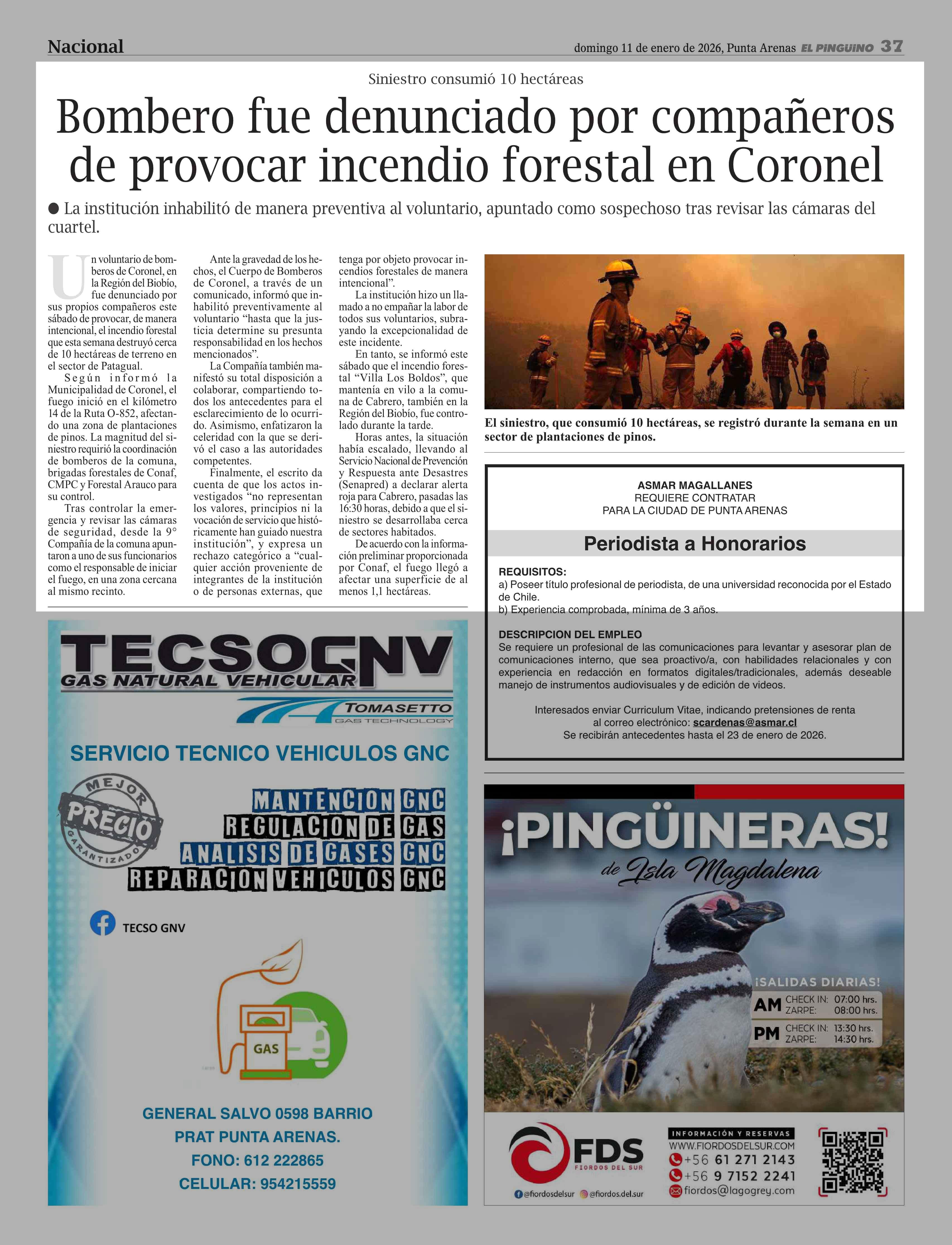 Bombero fue denunciado por compañeros de provocar incendio forestal en Coronel 11-01-2026 El Pingüino |
