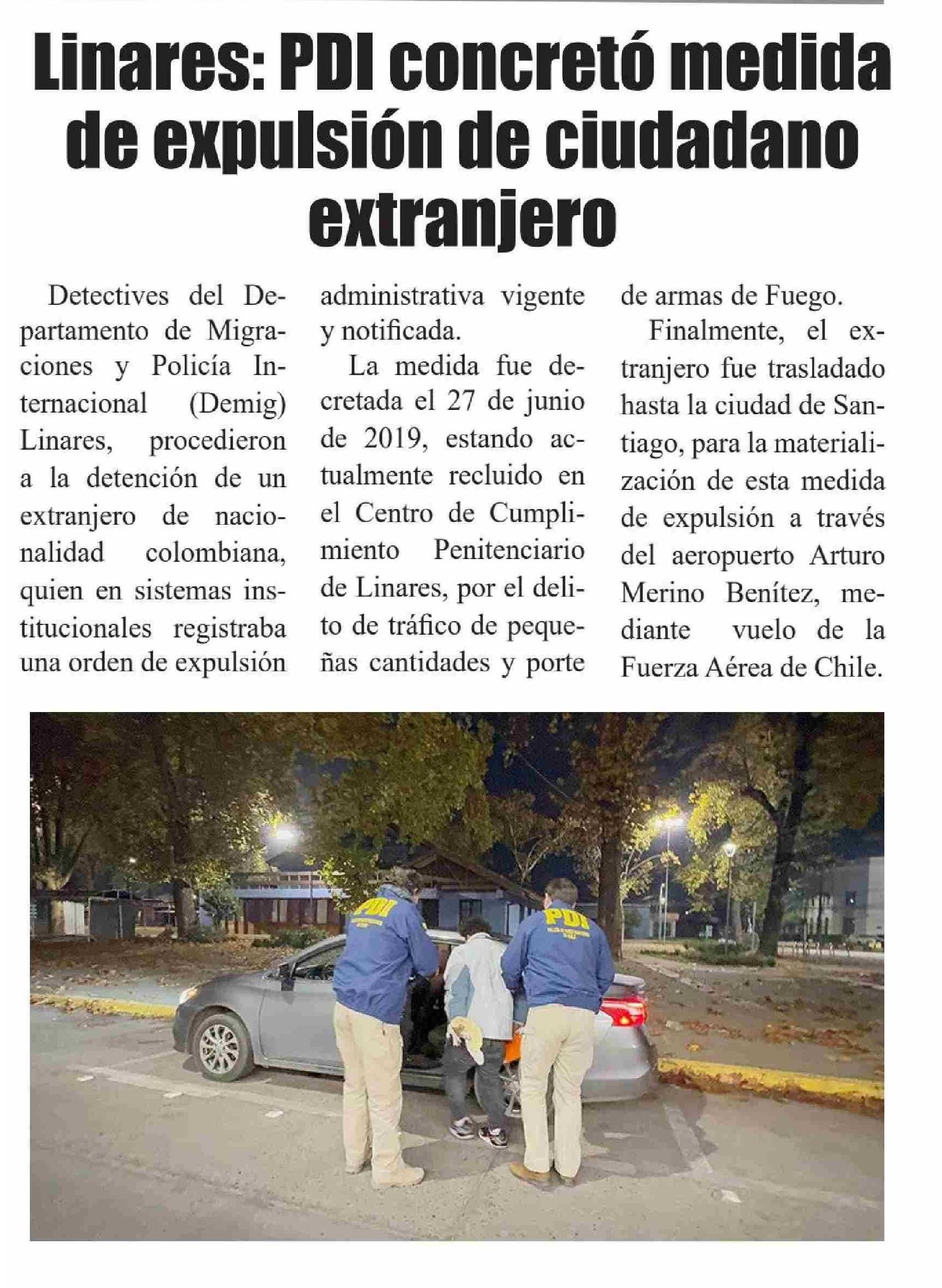 | Título: | Linares: PDI concretó medida de expulsión de ciudadano extranjero |