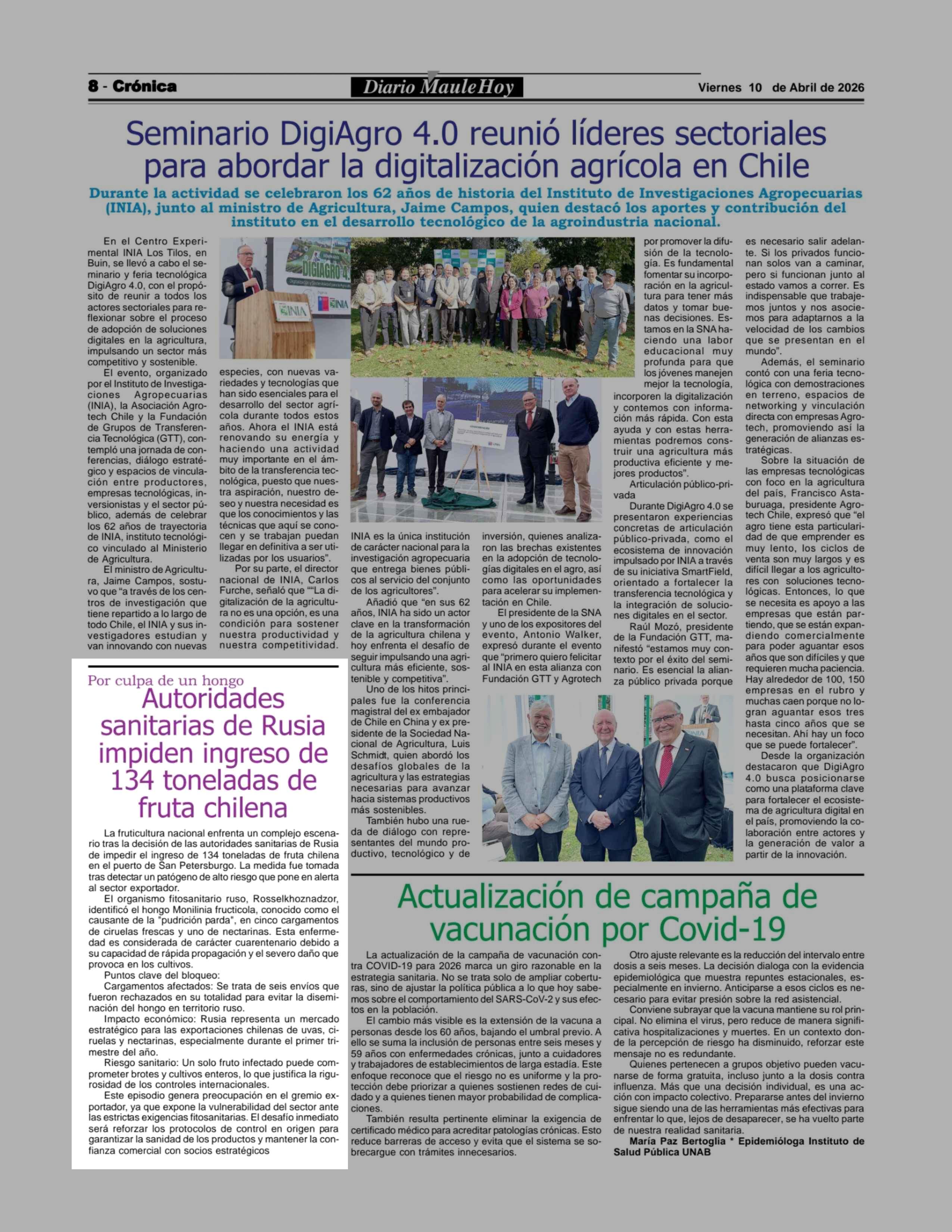 Por culpa de un hongo Autoridades sanitarias de Rusia impiden ingreso de 134 toneladas de fruta chilena 10-04-2026 Maule Hoy |