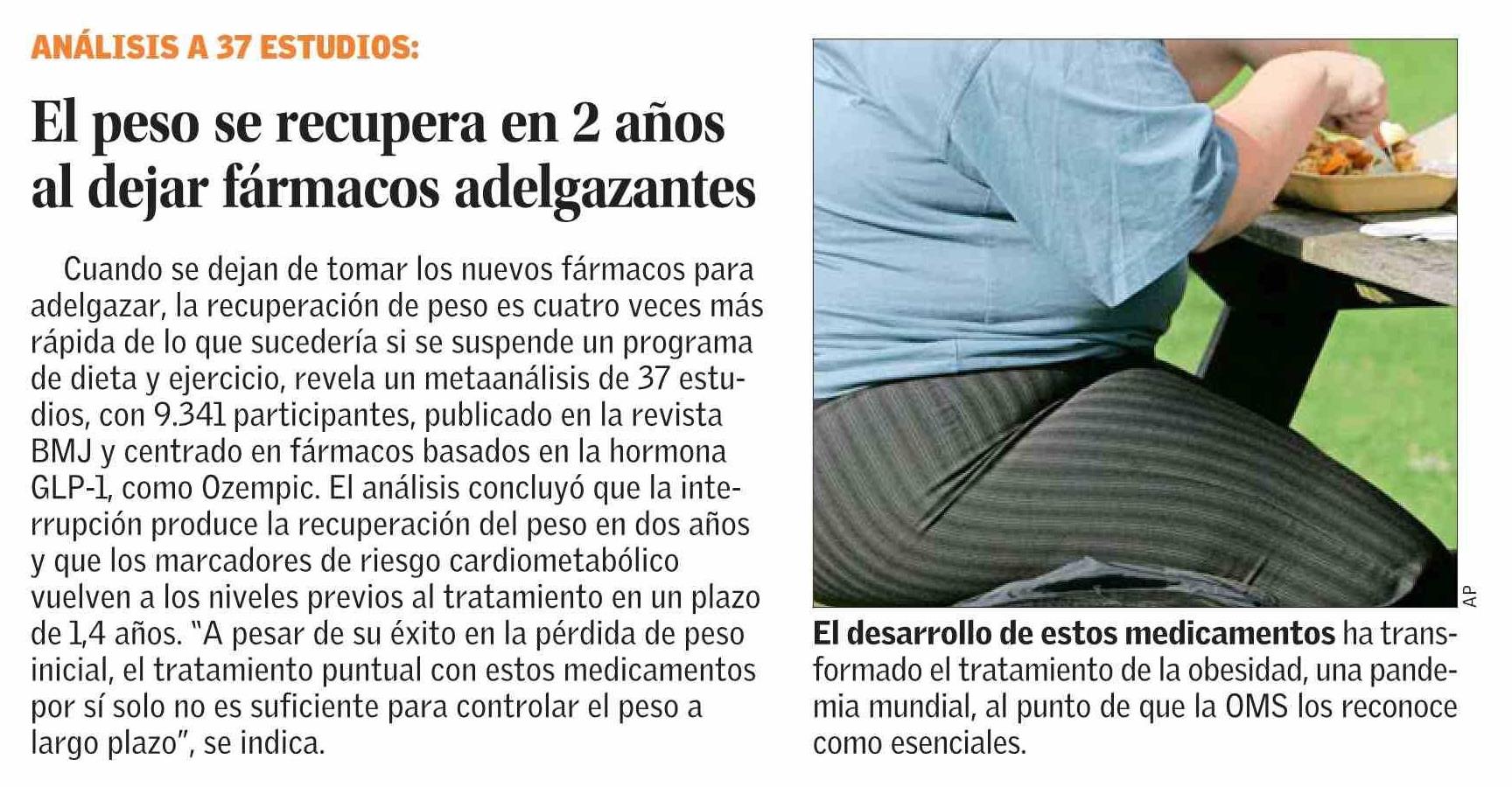 El peso se recupera en 2 años al dejar fármacos adelgazantes 09-01-2026 El Mercurio |