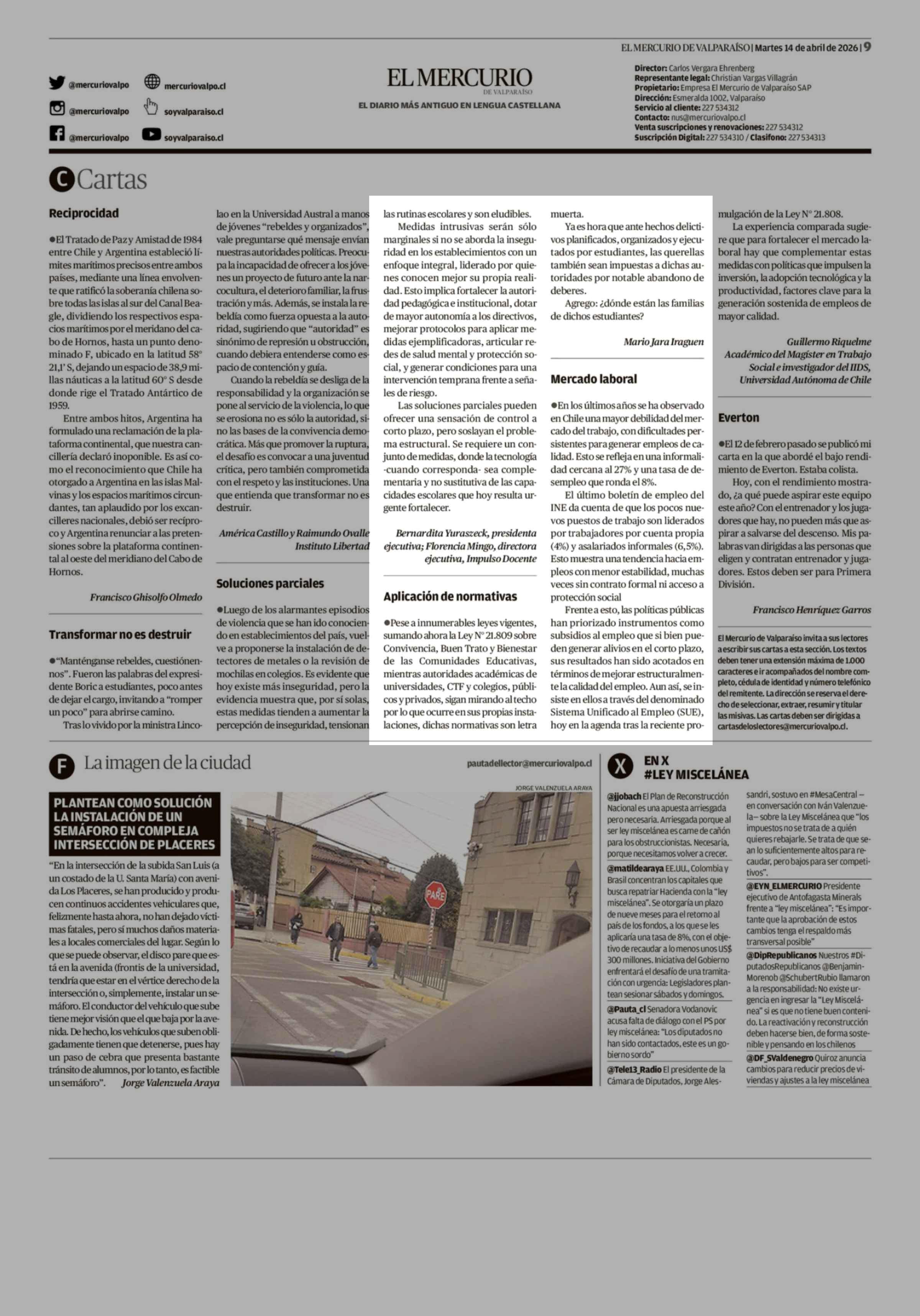 Cartas: Aplicación de normativas 14-04-2026 El Mercurio de Valparaíso |