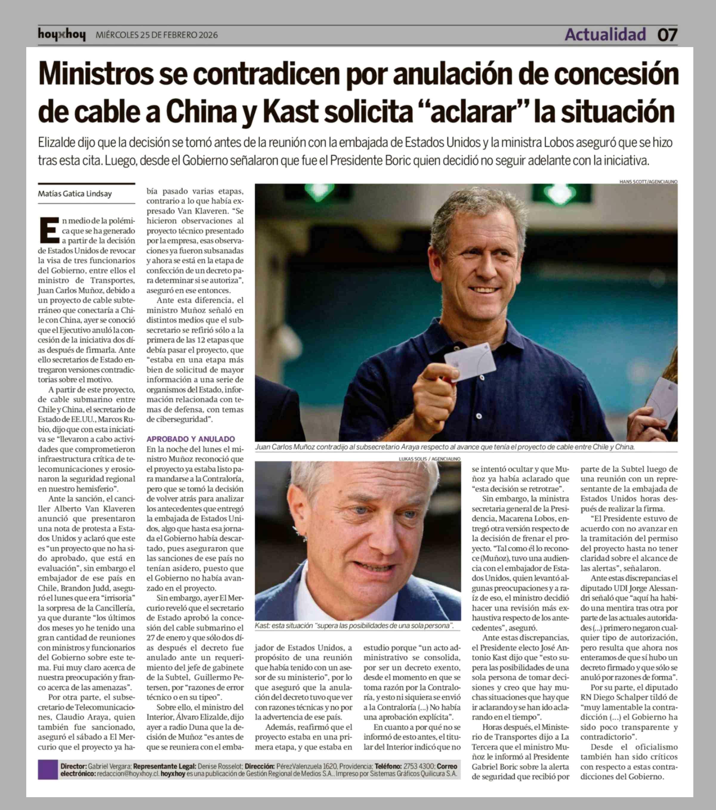Título: Ministros se contradicen por anulación de concesión de cable a China y Kast solicita "aclarar" la situación