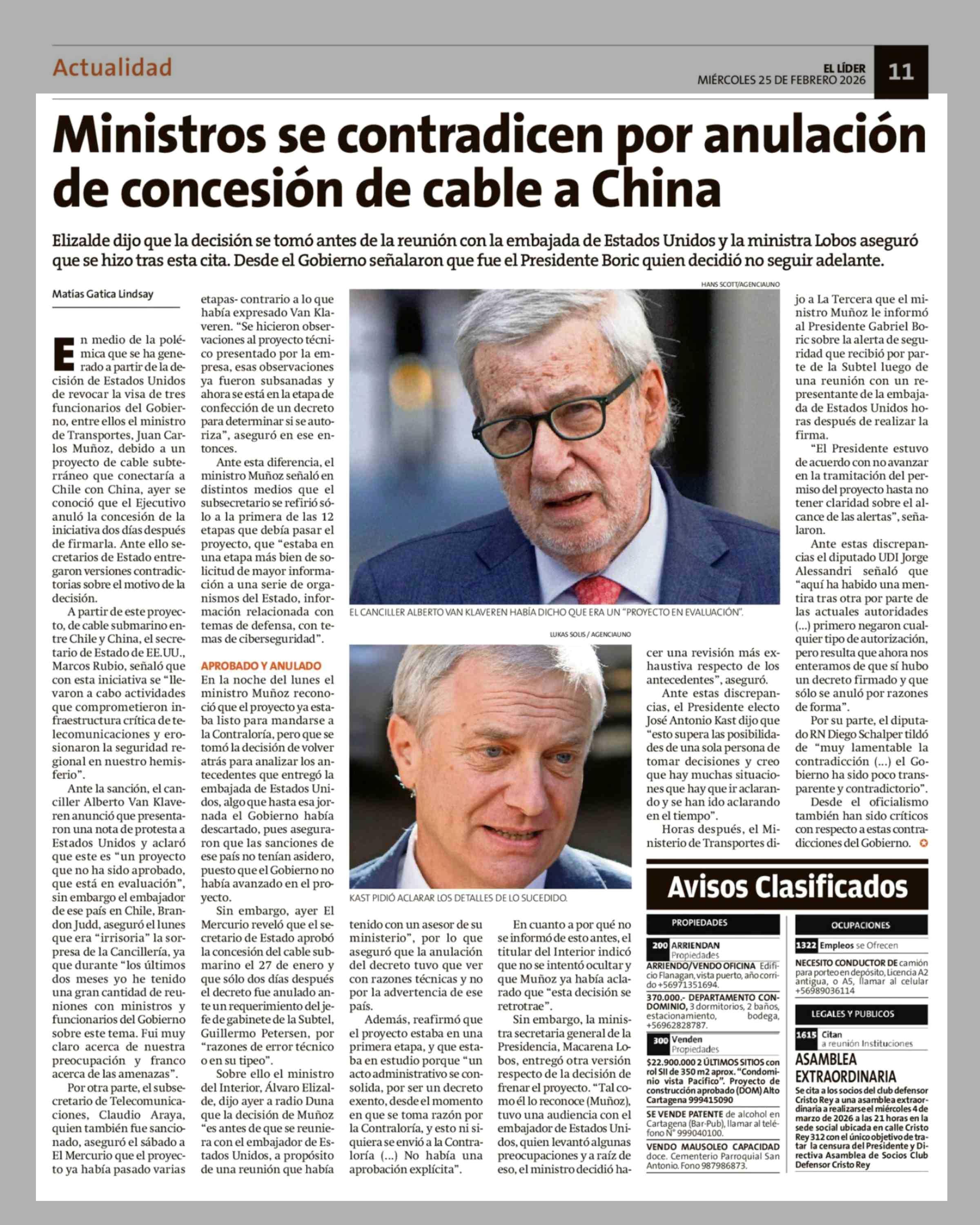 Ministros se contradicen por anulación de concesión de cable a China 25-02-2026 El Líder |