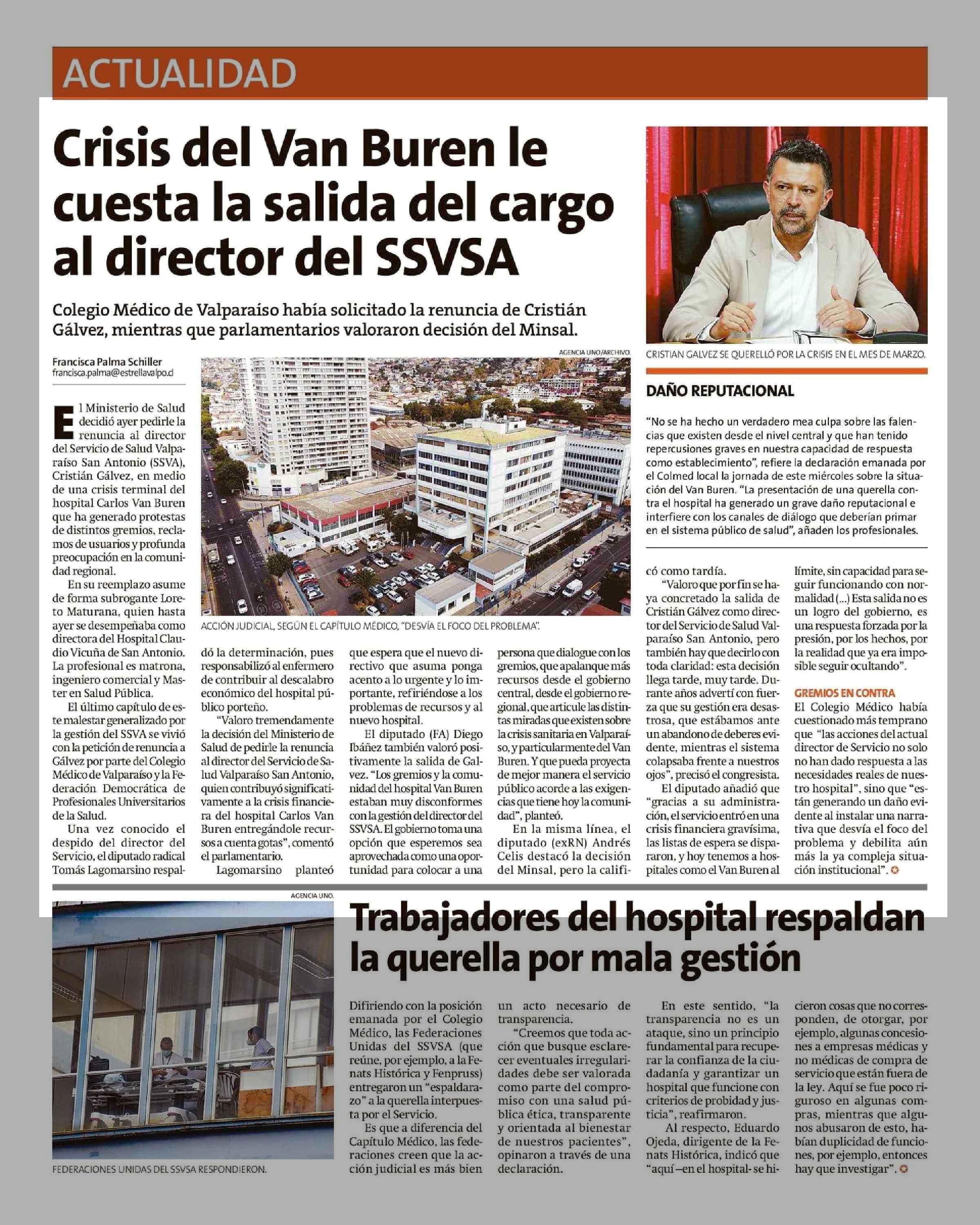 Crisis del Van Buren le al director del SSVSA cuesta la salida del cargo 10-04-2025 La Estrella de Valparaíso |