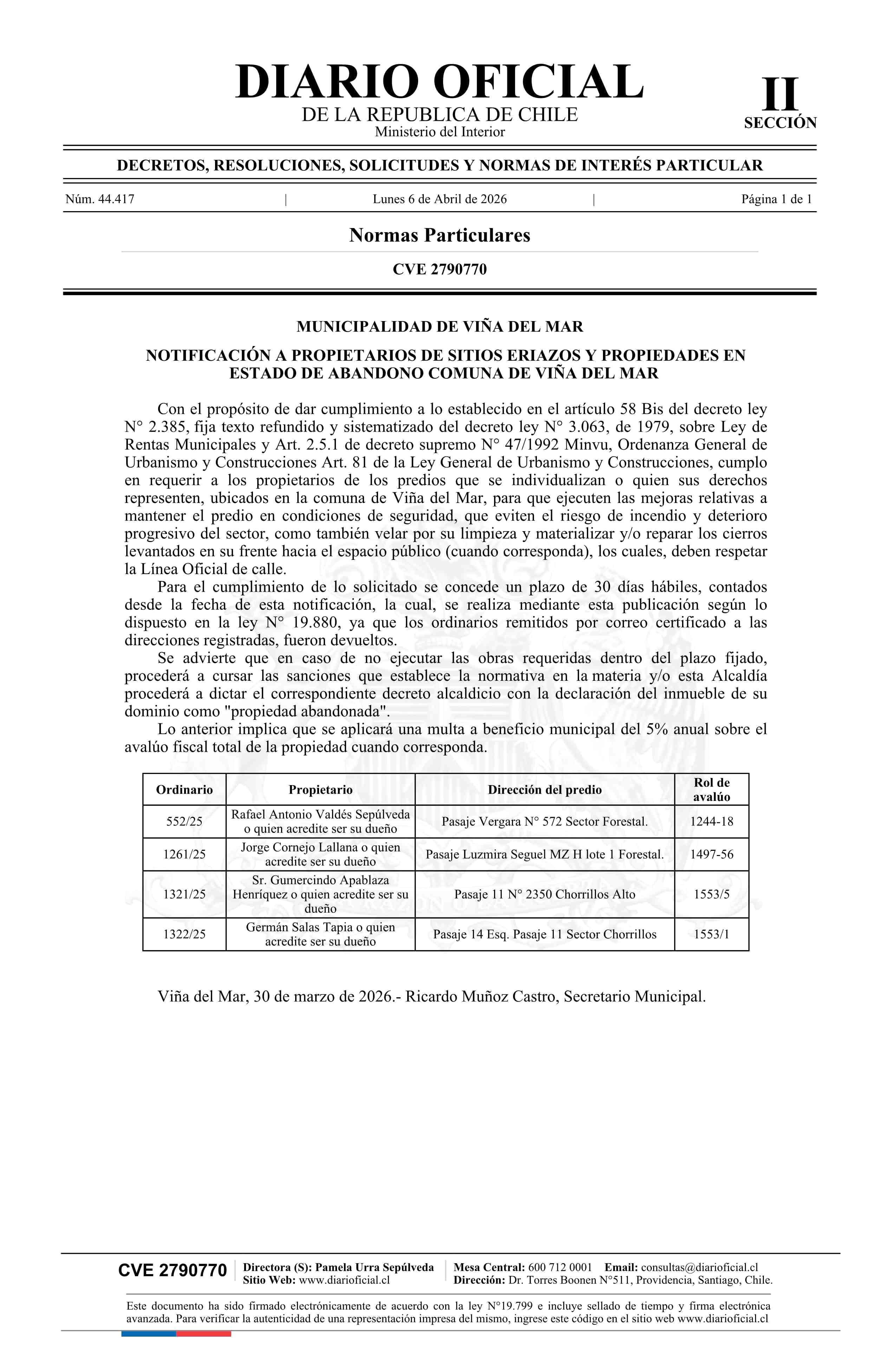 Notificación de Acto Administrativo Notificación a propietarios de sitios eriazos y propiedades en estado de abandono, comuna de Viña del Mar 06-04-2026 Diario Oficial Edición Electrónica |