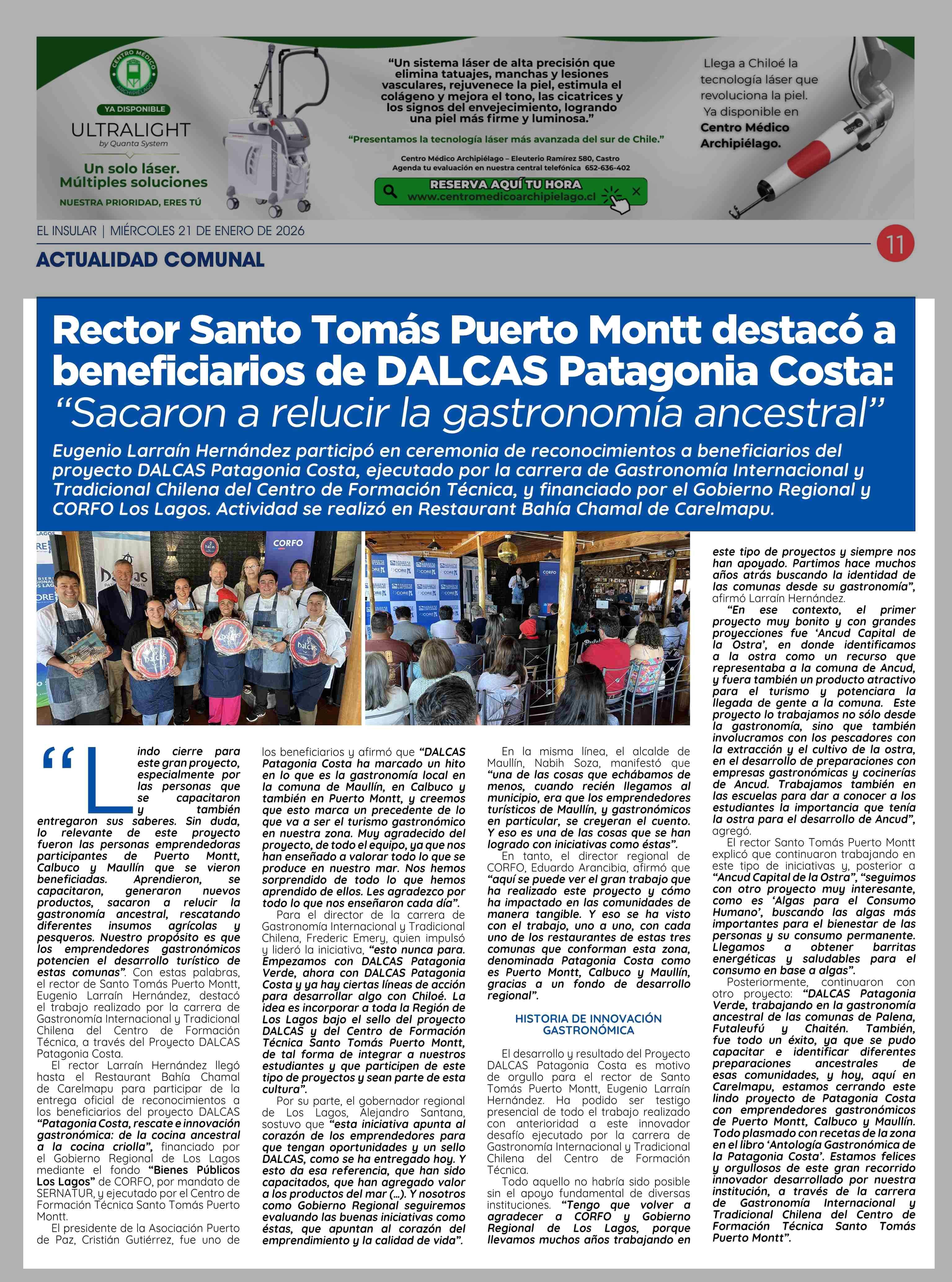 Rector Santo Tomás Puerto Montt destacó a beneficiarios de DALCAS Patagonia Costa: "Sacaron a relucir la gastronomía ancestral" 21-01-2026 El Insular |