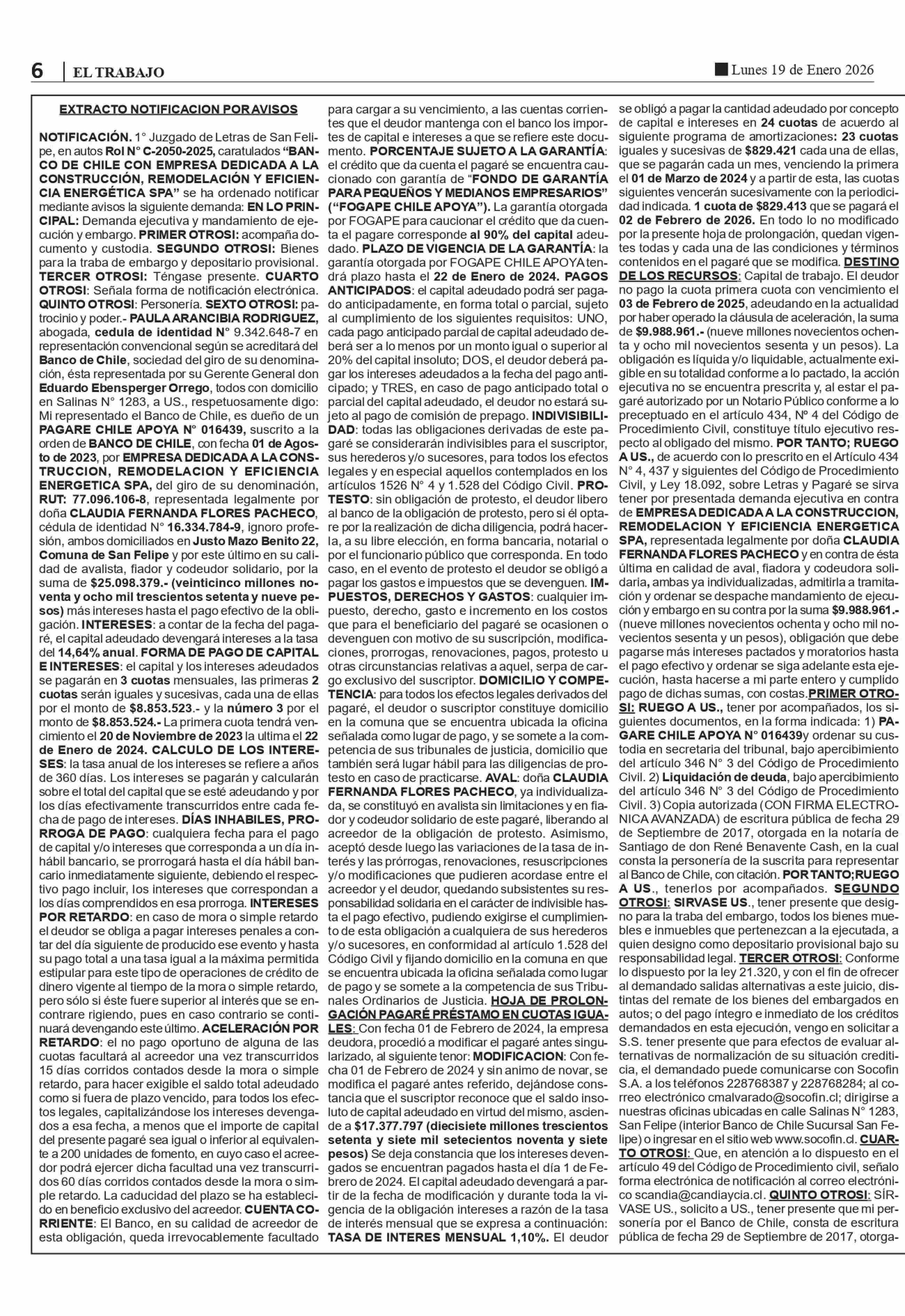 Extractos: EXTRACTO NOTIFICACION PORAVISOS 19-01-2026 El Trabajo |