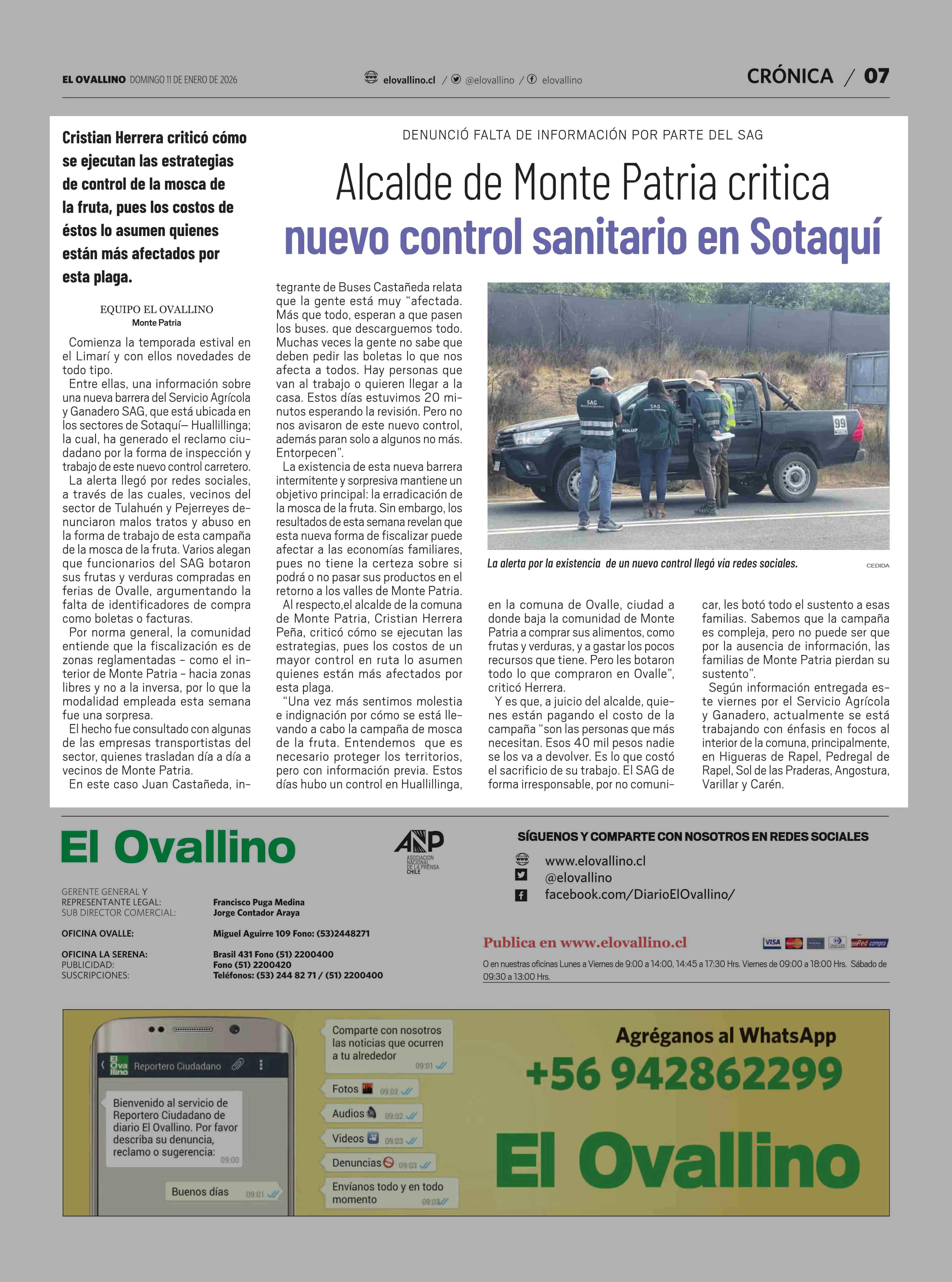 Alcalde de Monte Patria critica nuevo control sanitario en Sotaquí 11-01-2026 El Ovallino |
