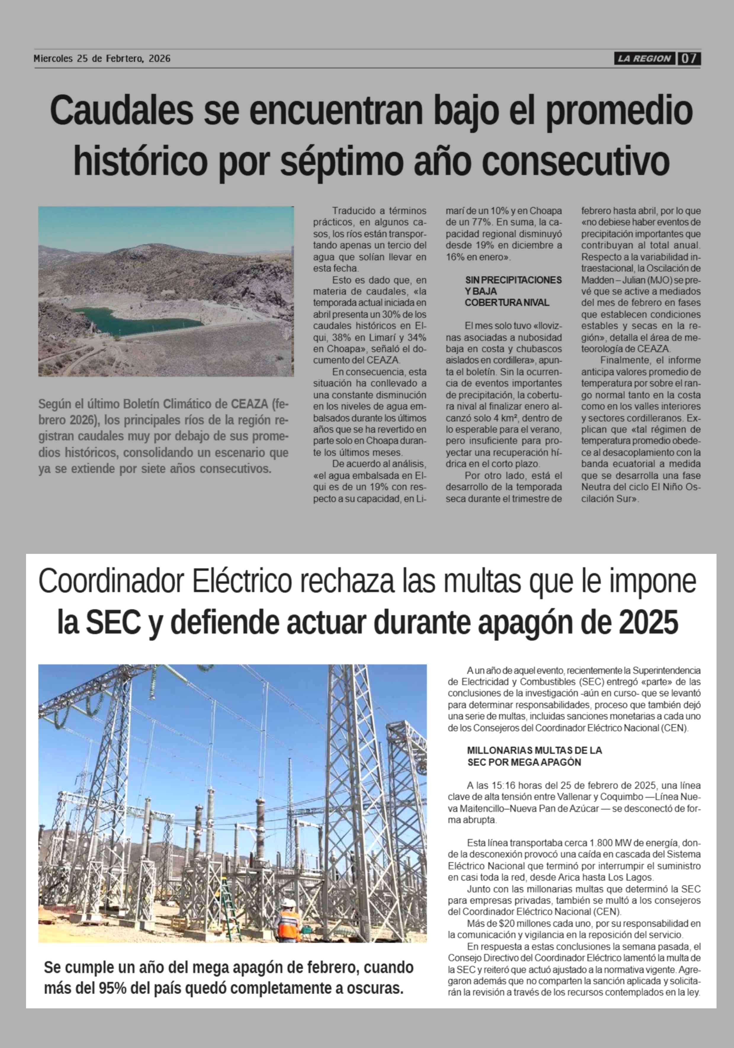 Coordinador Eléctrico rechaza las multas que le impone la SEC y defiende actuar durante apagón de 2025 25-02-2026 Diario la Región |