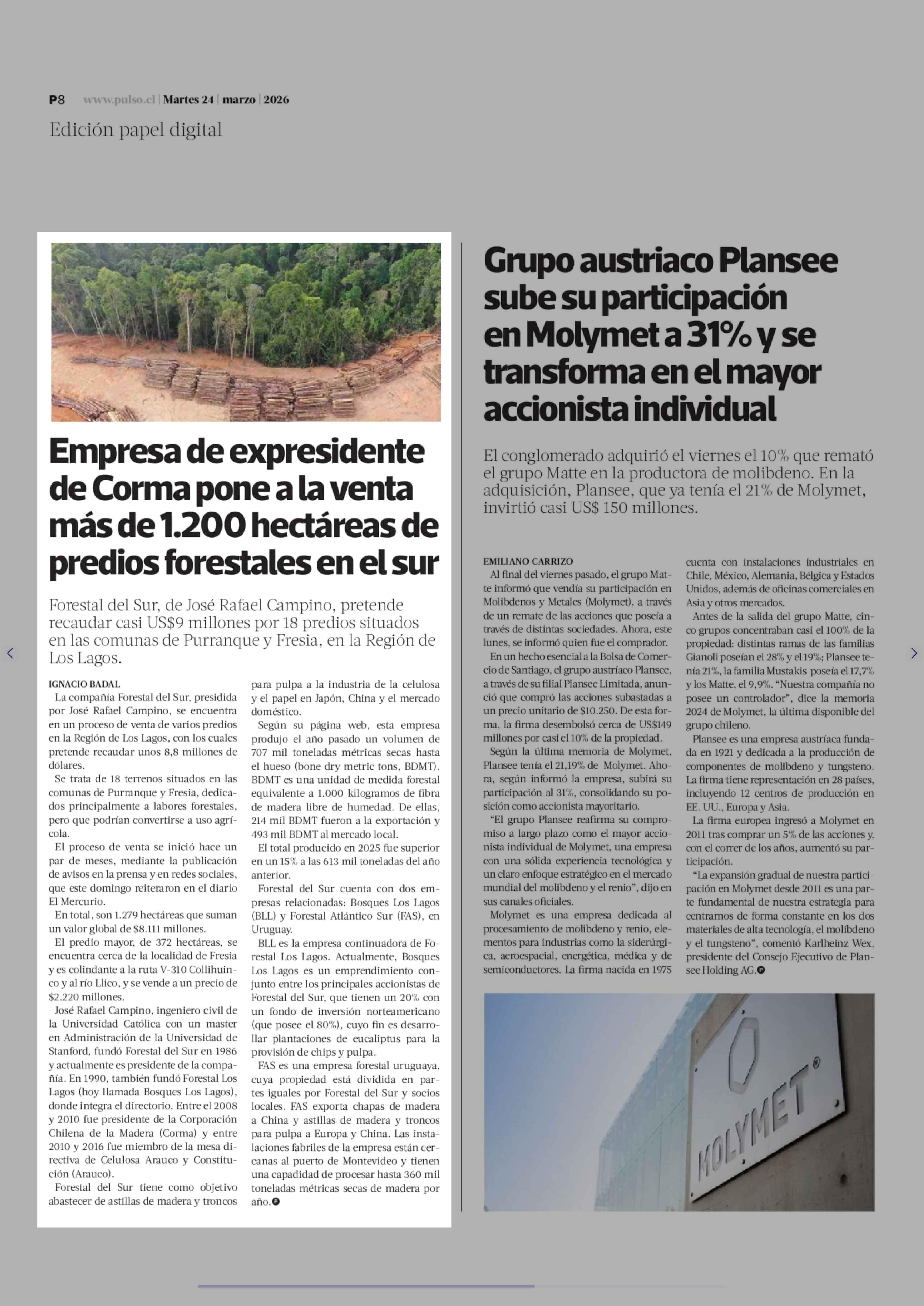 Título: Empresa de expresidente de Corma pone a la venta más de 1.200 hectáreas de predios forestales en el sur