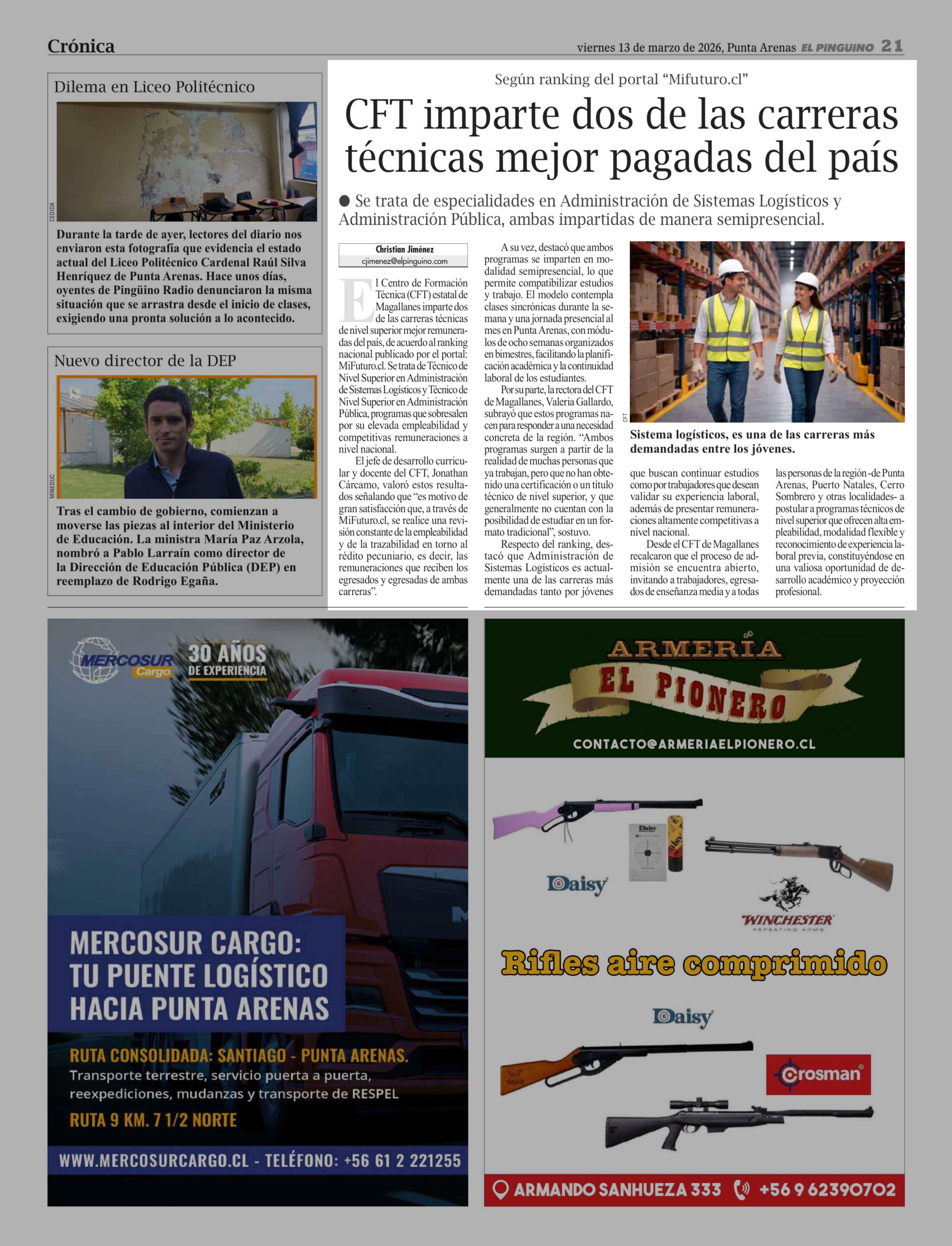 CFT imparte dos de las carreras técnicas mejor pagadas del país 13-03-2026 El Pingüino |