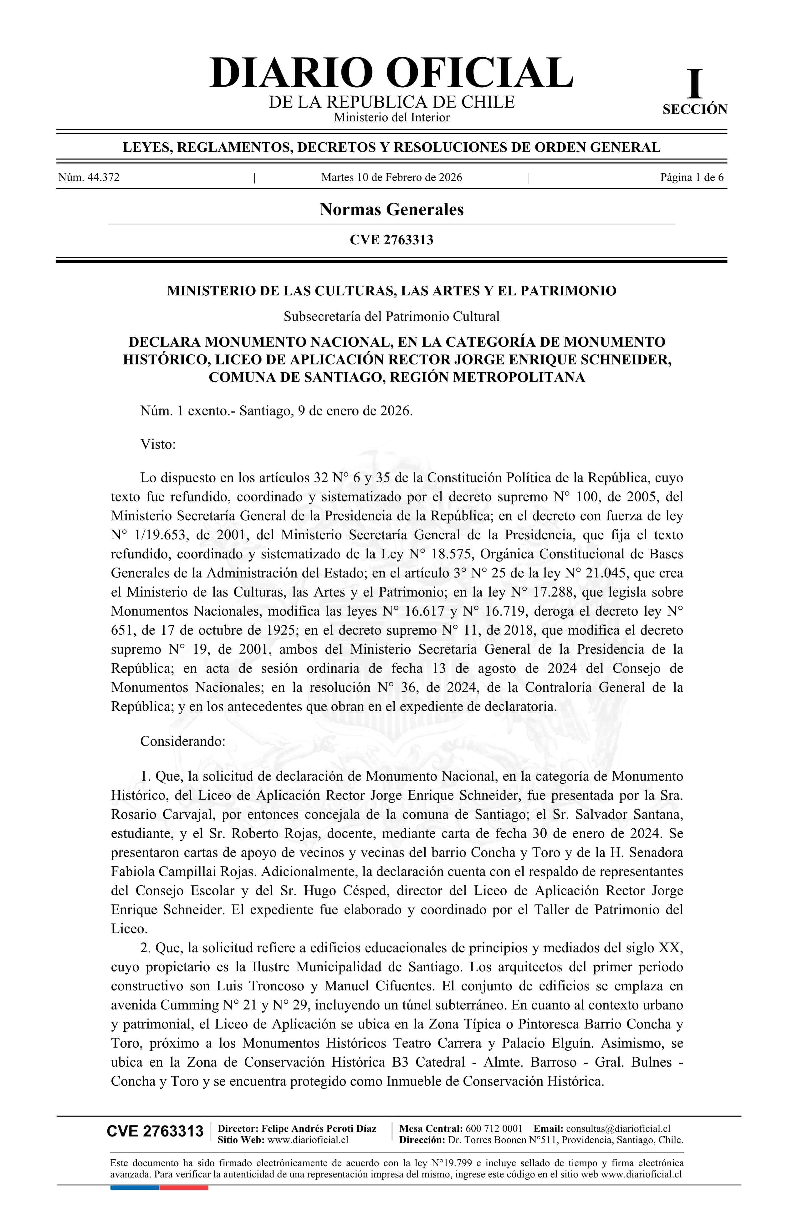 Título: Decreto exento número 1, de 2026.- Declara Monumento Nacional, en la categoría de Monumento Histórico, el Liceo de Aplicación Rector Jorge Enrique Schneider, comuna de Santiago, Región Metropolitana
