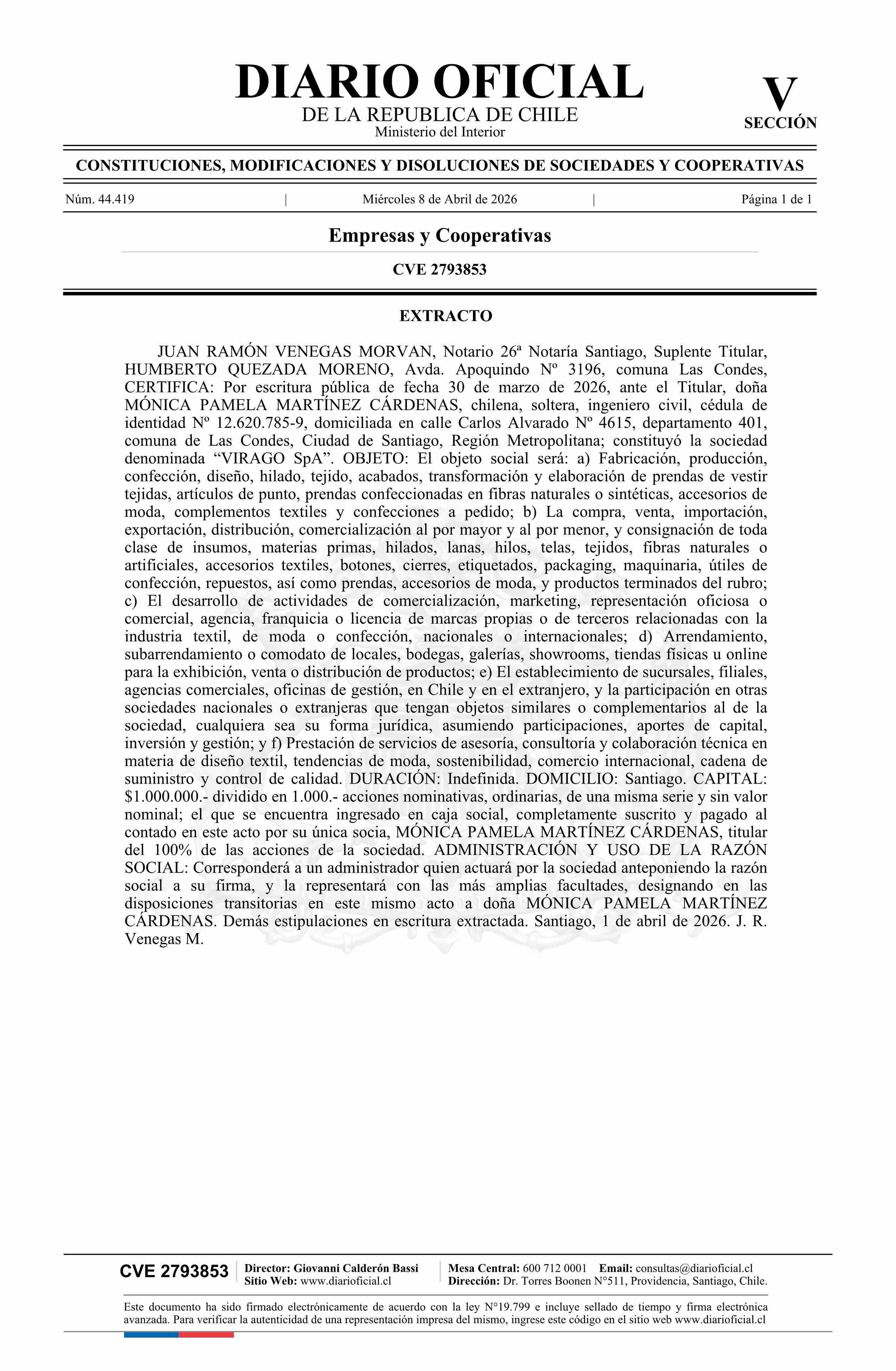 VIRAGO SpA 08-04-2026 Diario Oficial Edición Electrónica |