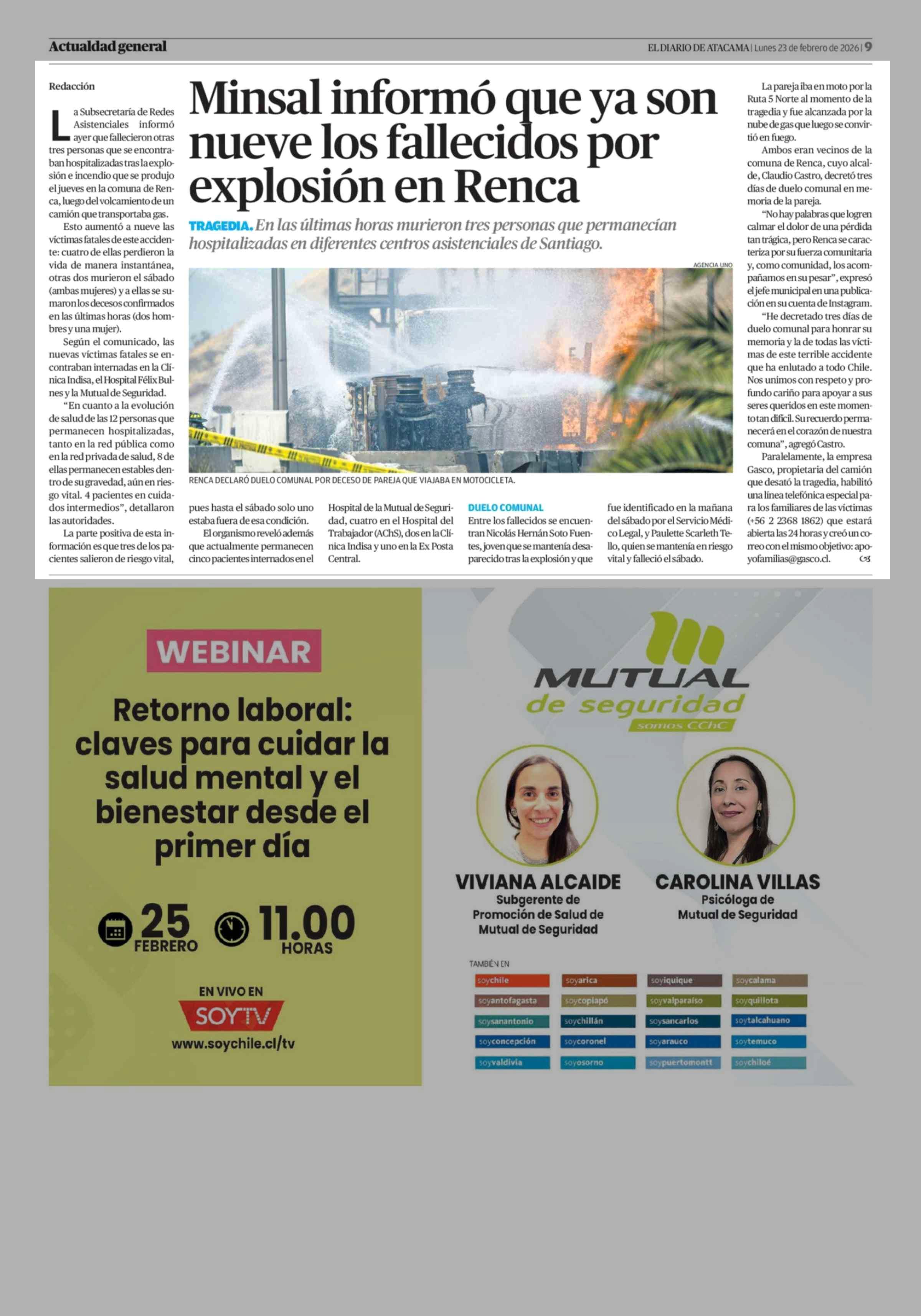 Minsal informó que ya son nueve los fallecidos por explosión en Renca 23-02-2026 El Diario de Atacama |