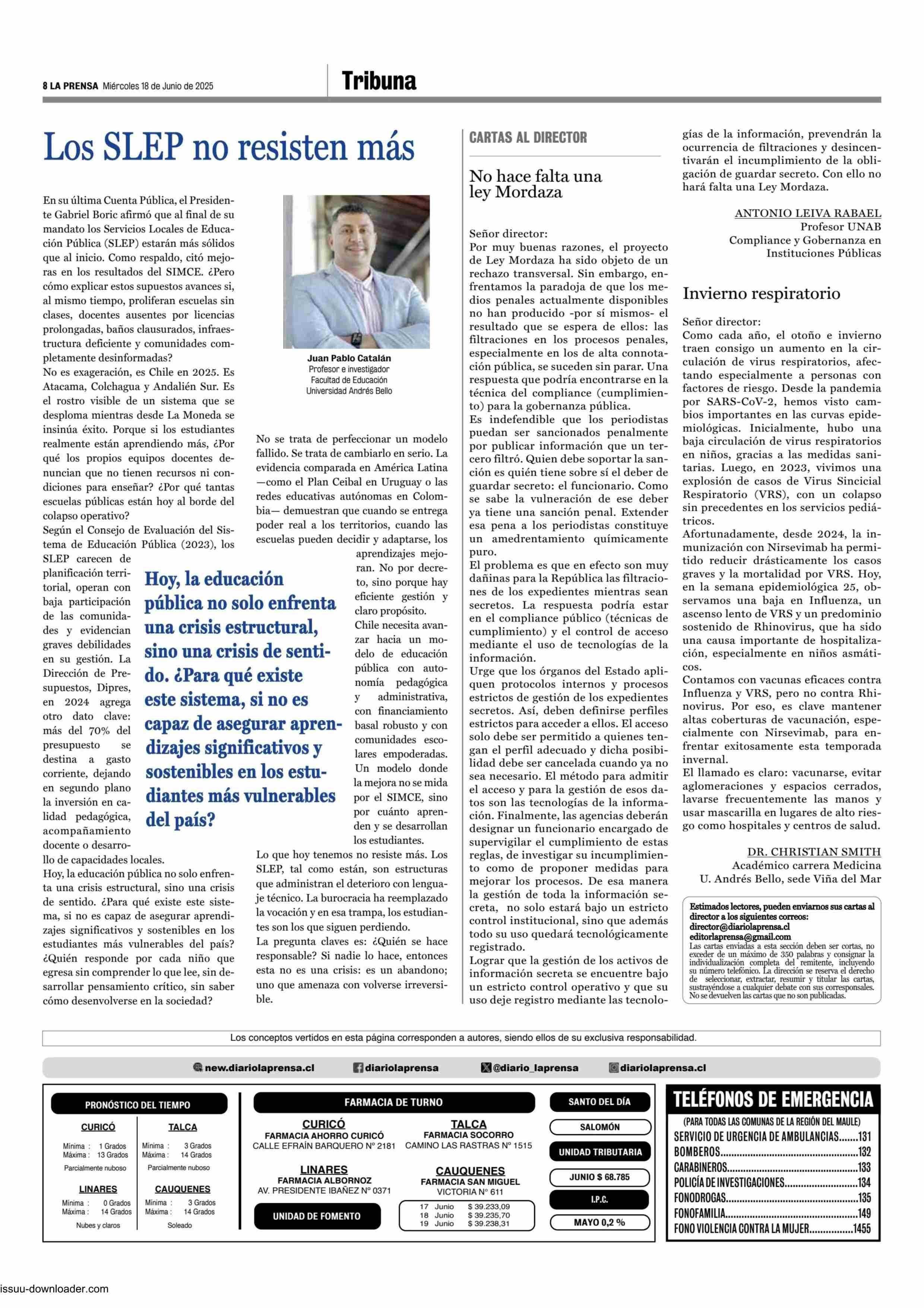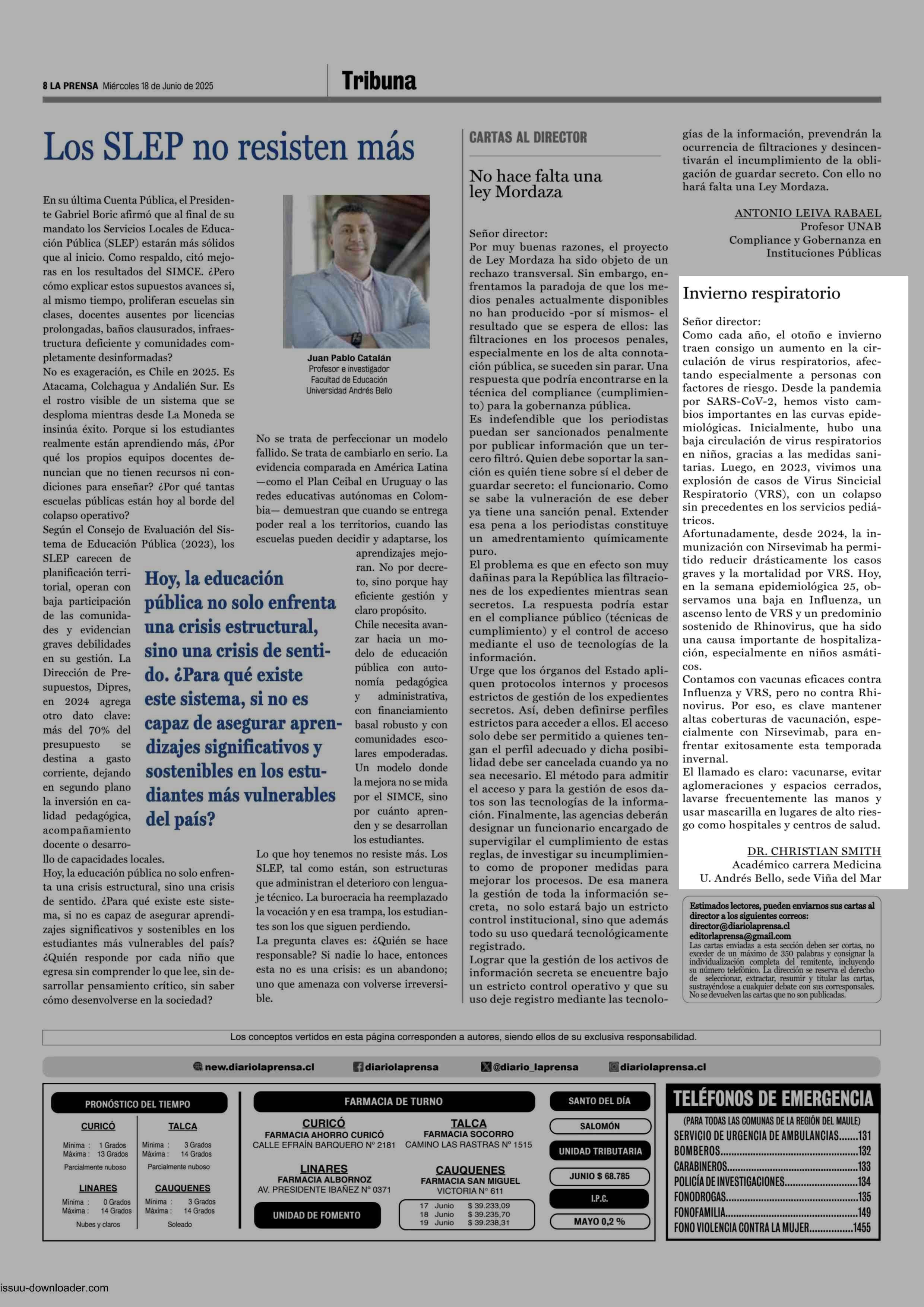 CARTAS: Invierno respiratorio 18-06-2025 La Prensa de Curicó |