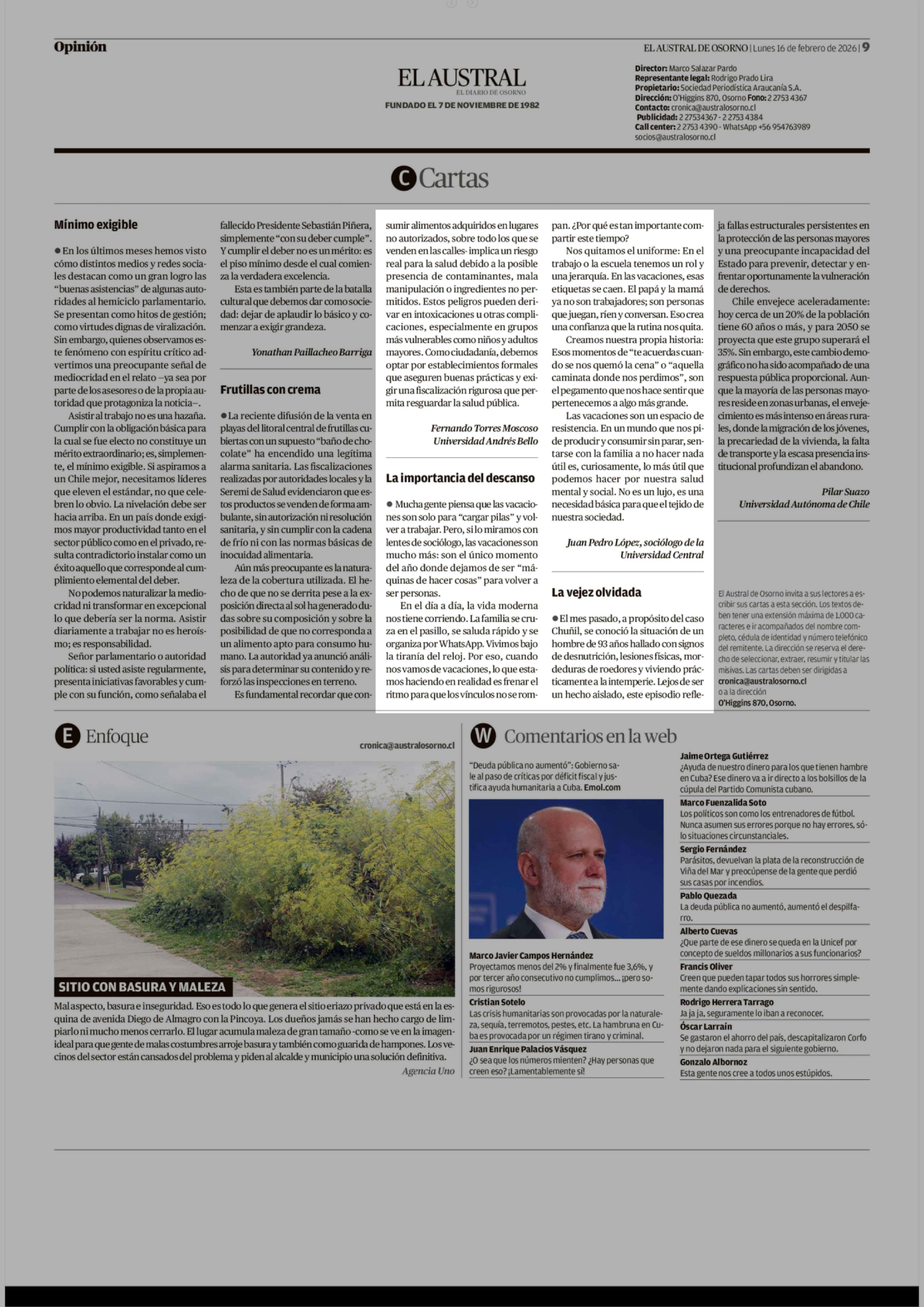 Cartas: La importancia del descanso 16-02-2026 El Austral de Osorno |