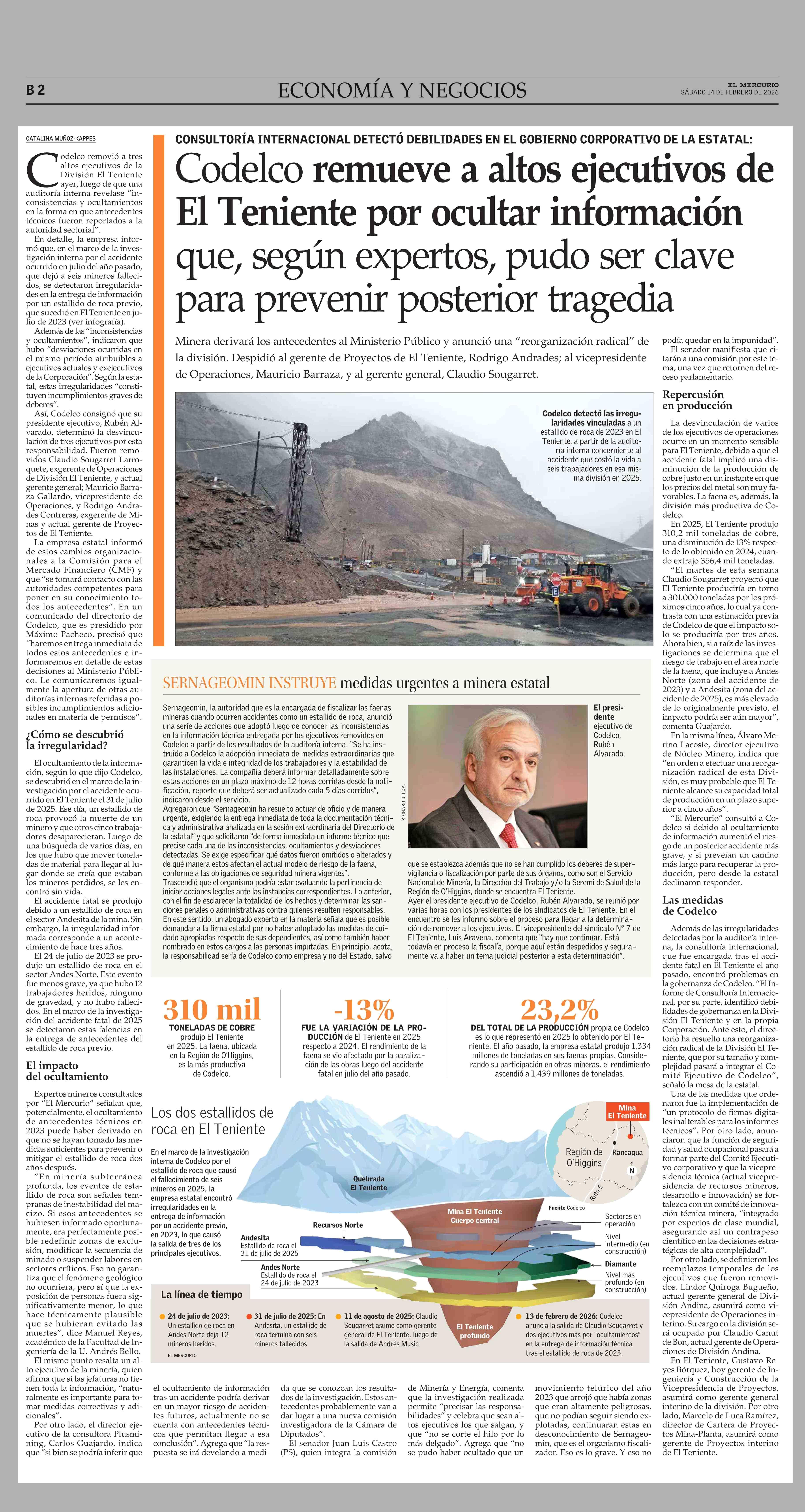 Título: Codelco remueve a altos ejecutivos de El Teniente por ocultar información que, según expertos, pudo ser clave para prevenir posterior tragedia