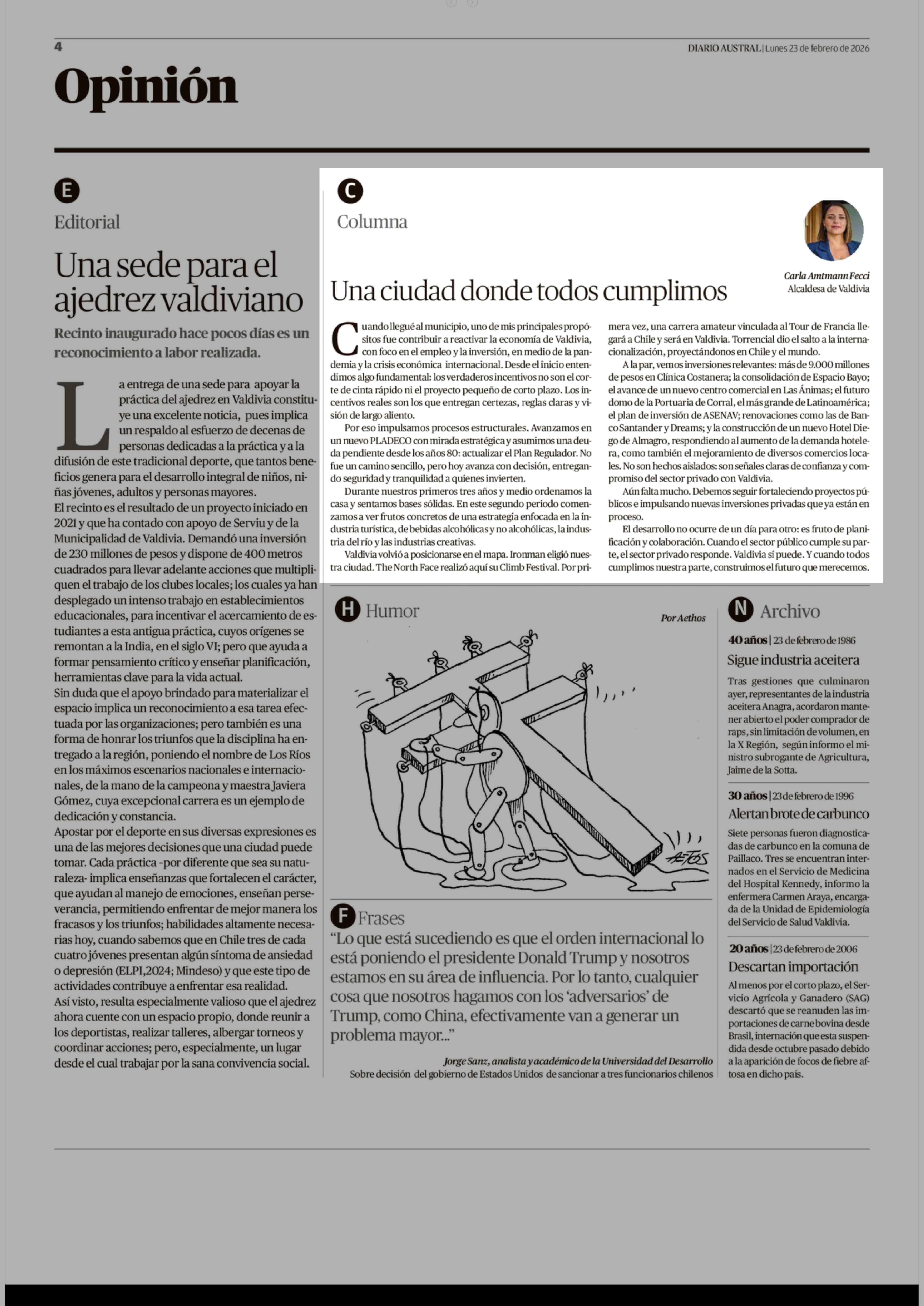 Columnas de Opinión: Una ciudad donde todos cumplimos 23-02-2026 Diario Austral Región de Los Ríos |